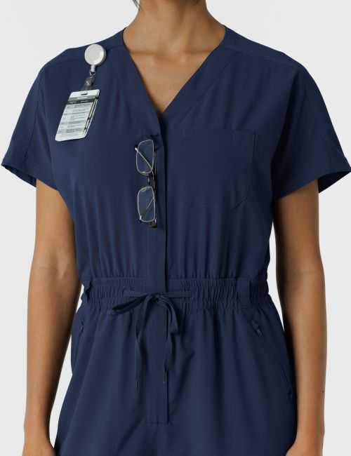 A V-neck medical suit, fitted with multiple details and pockets, which is suitable for all medical professions.