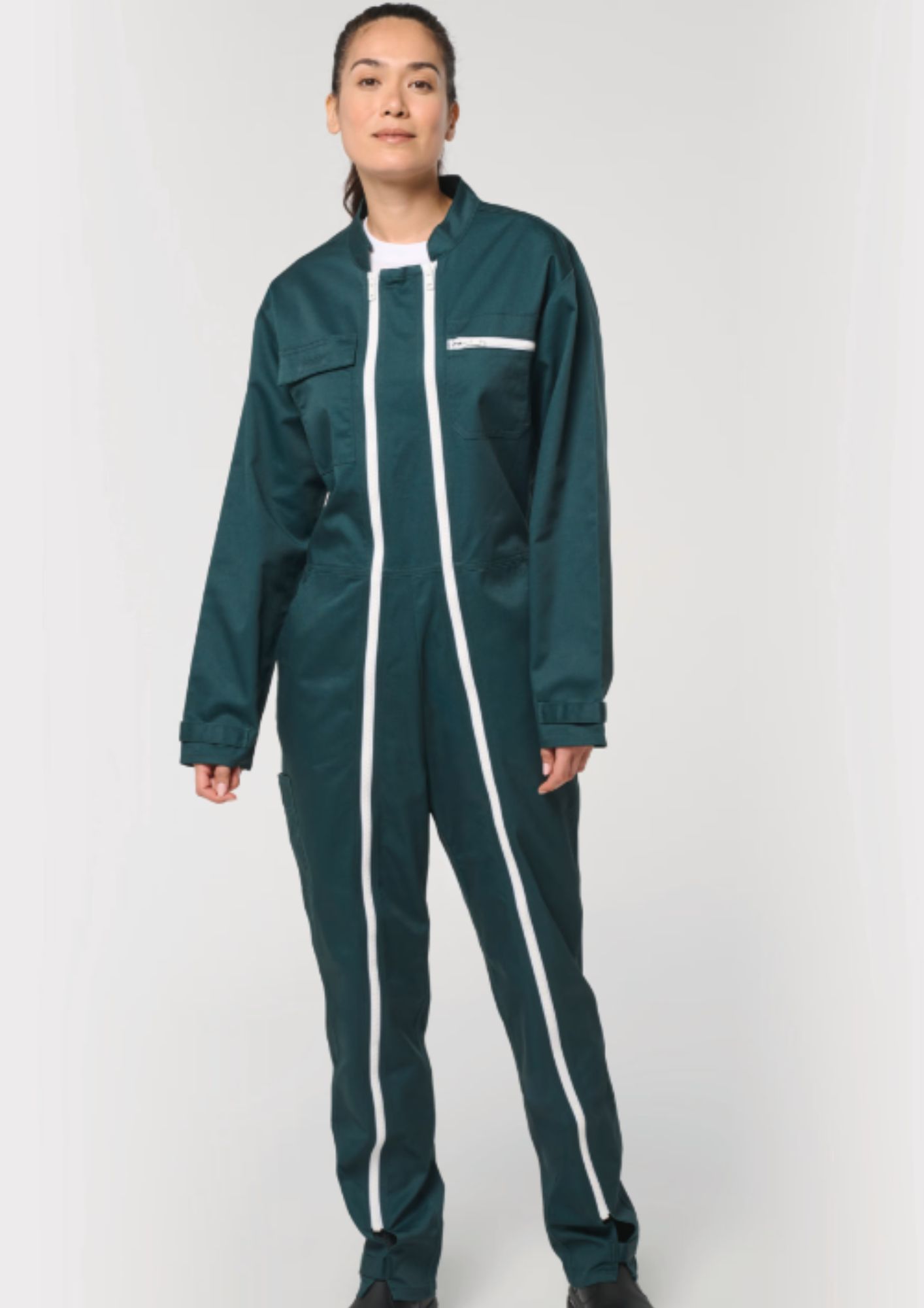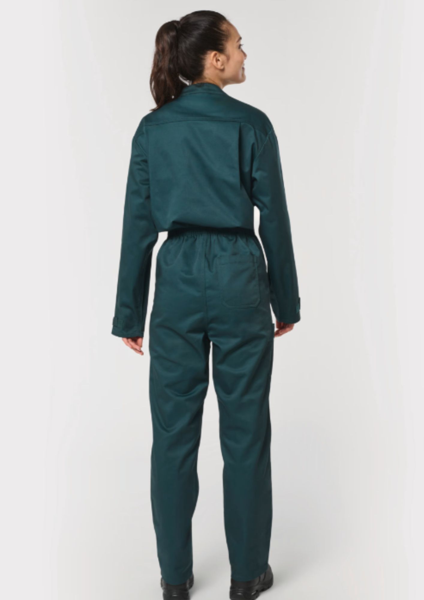 Unisex double-zip coverall providing comfort and freedom of movement with a back panel featuring pleats and an elasticated waist, equipped with multiple practical pockets (chest, sides, thigh, and back), secure zip and hook-and-loop closures, reinforced with double and triple stitching for optimal durability, and adjustable cuffs and leg hems for a personalized fit.