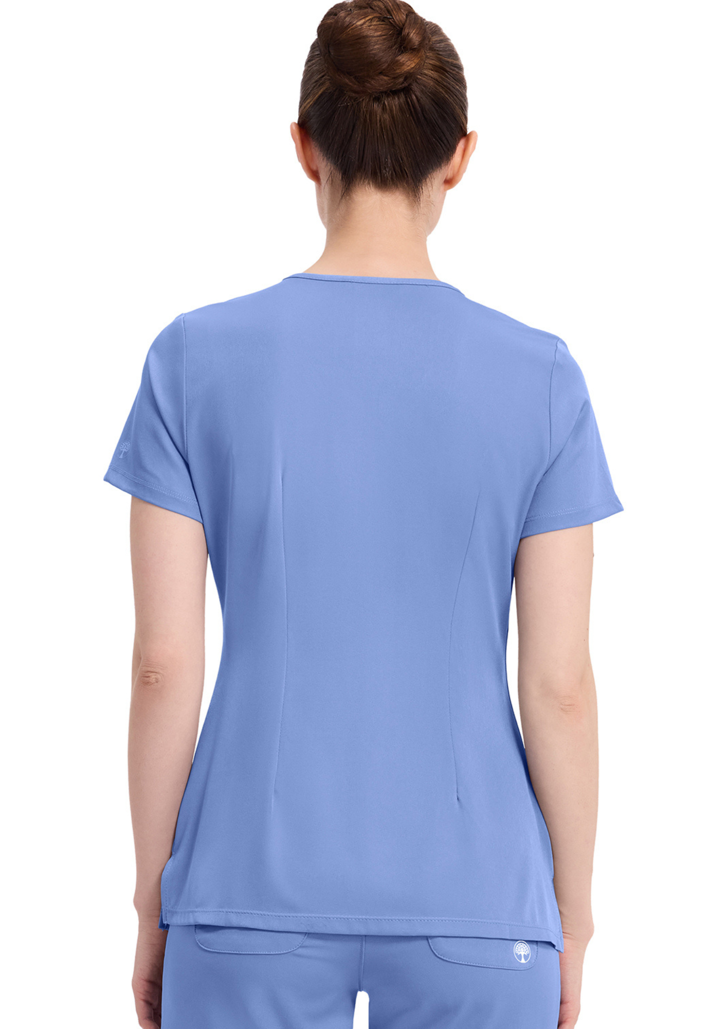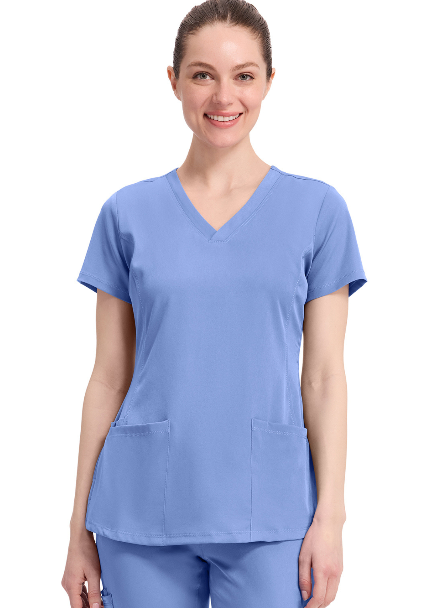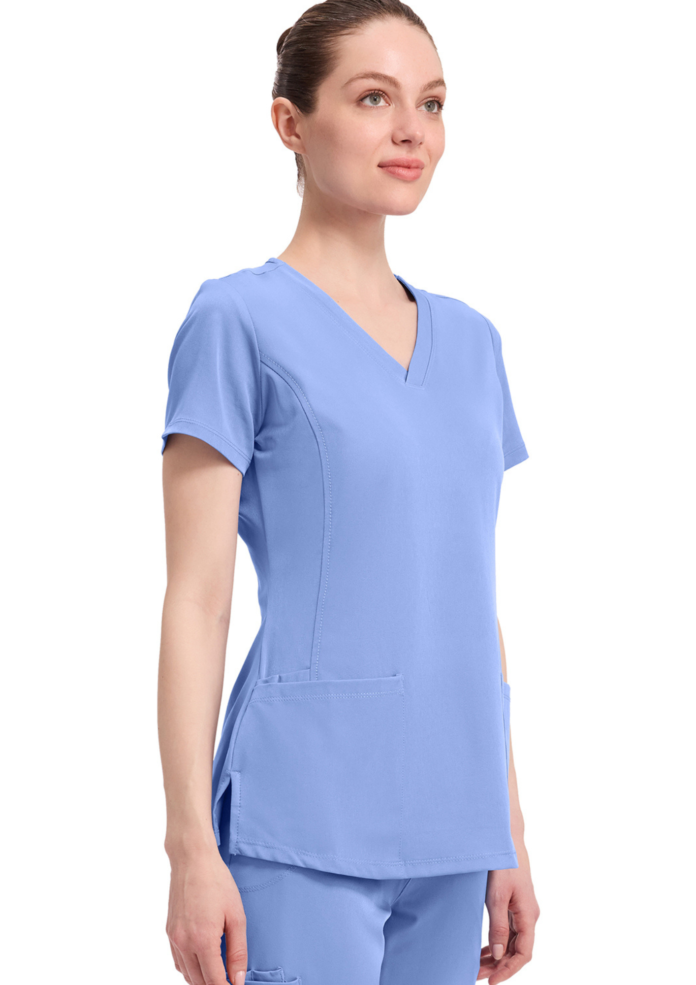 Combine absolute comfort, elegance, and performance with this medical scrub top designed to support you through your most active days. Made from an ultra-soft, lightweight, and stretchy fabric, it offers excellent breathability and effectively wicks away moisture to keep you cool and comfortable all day long. Its modern V-neck adds a touch of elegance, while the front princess seams and tailored fit enhance the silhouette without restricting movement. Practical and functional, it features 4 spacious pockets and a media pocket to keep your essentials within easy reach, along with side slits that ensure optimal mobility. Easy to care for and built to last, this medical scrub top strikes the perfect balance between style, comfort, and efficiency, helping you feel confident and comfortable at work every day.