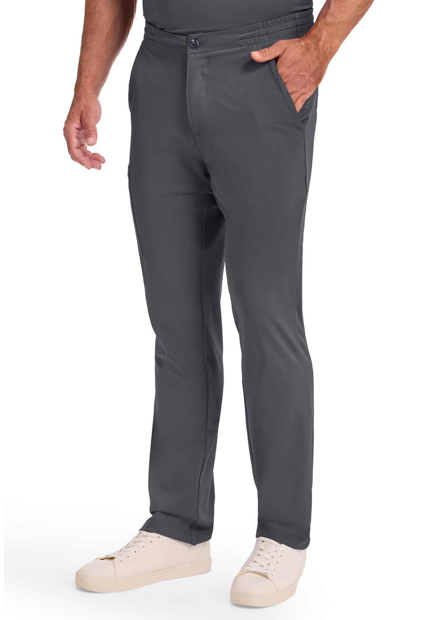 Modern in style, it is made from an ultra-soft, lightweight, and stretchy fabric that wicks away moisture to keep you comfortable from morning to night. Its elastic waistband adapts perfectly to your shape, while the elegant straight-leg cut ensures a professional and polished look.