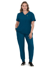 A women's medical uniform top, with a modern design and V-neck, which merges style and functionality. Equipped with a chest pocket, a sleeve pocket and three pen slots, it offers easy access to all your essentials. It is suitable for all medical professions: caregiver, dentist, nurse or even veterinarian.