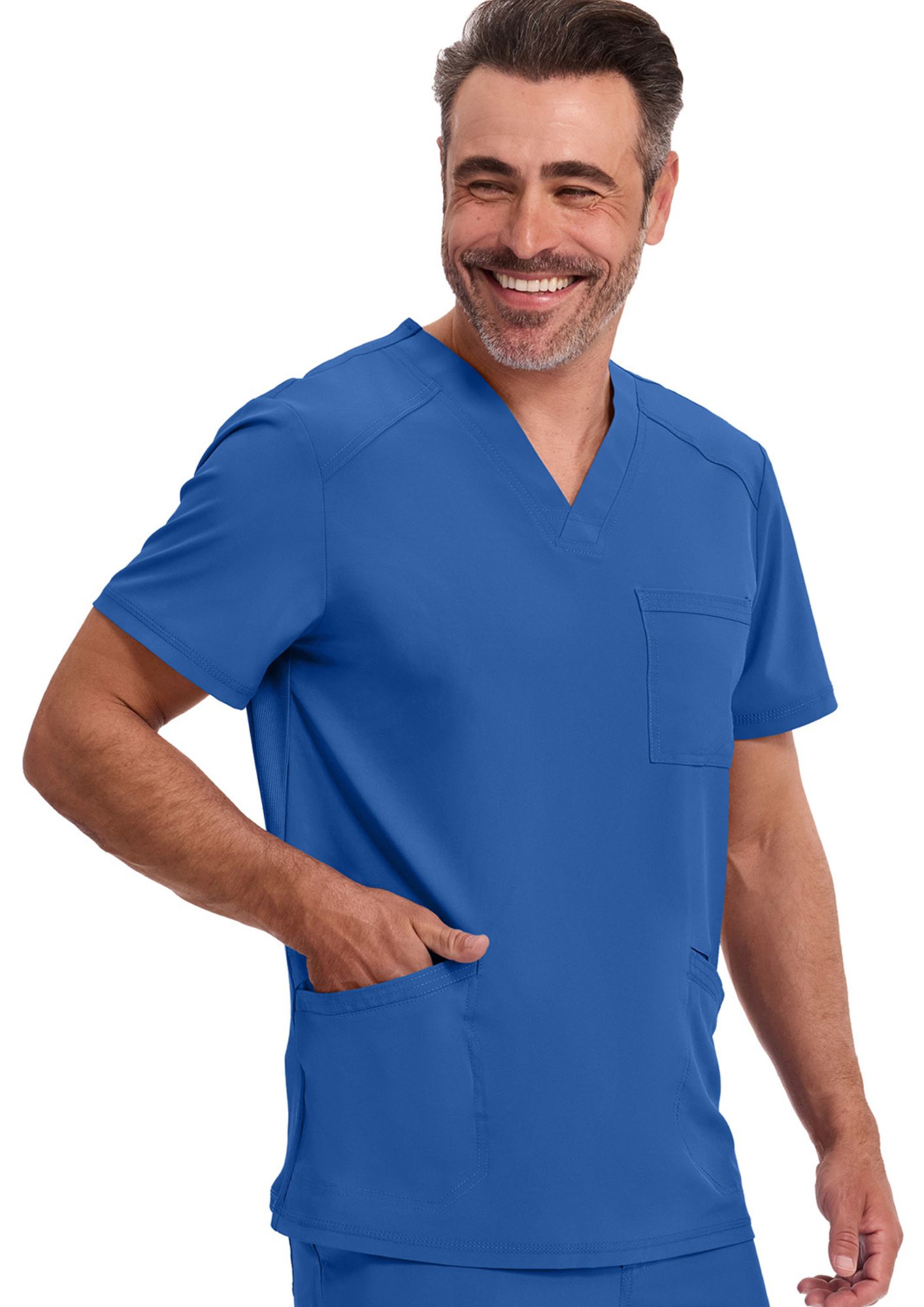 This men’s medical scrub top perfectly blends modern style, exceptional comfort, and innovative fabric technology to support you throughout your workday with confidence and ease. Made from a breathable, soft-touch fabric, it features advanced antibacterial technology that helps prevent odors and keeps you feeling fresh all day long, even during the busiest shifts. The fabric is moisture-wicking, odor-resistant, and wrinkle-free, ensuring a clean and polished look from morning to night. Its straight men’s fit and V-neck design deliver a professional, contemporary appearance, while the three practical pockets —two front patch pockets and one chest pocket— keep your essentials within easy reach. Two elastane side panels provide enhanced flexibility and freedom of movement. A scrub top designed for professionals who want comfort, performance, and style, every single day.