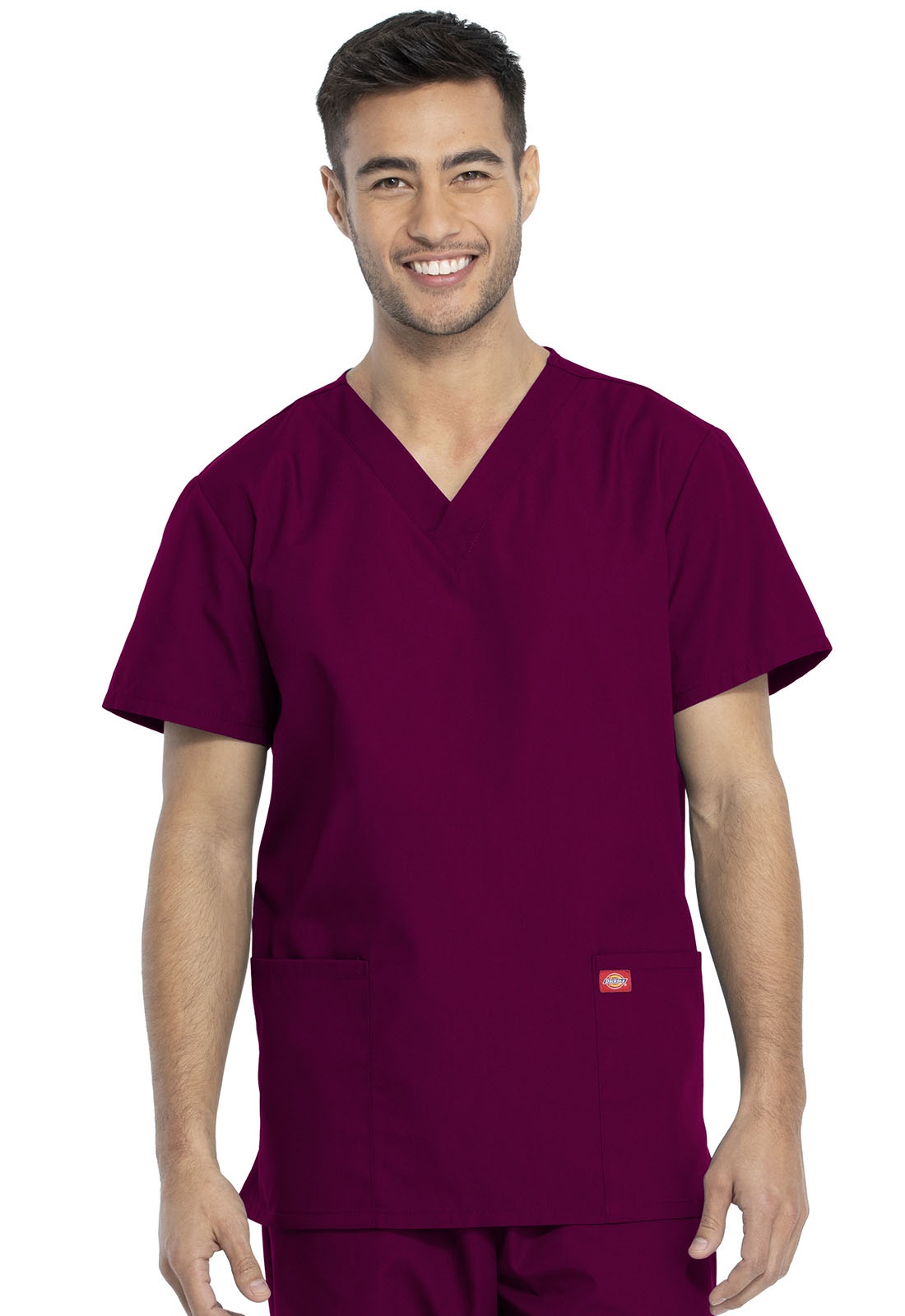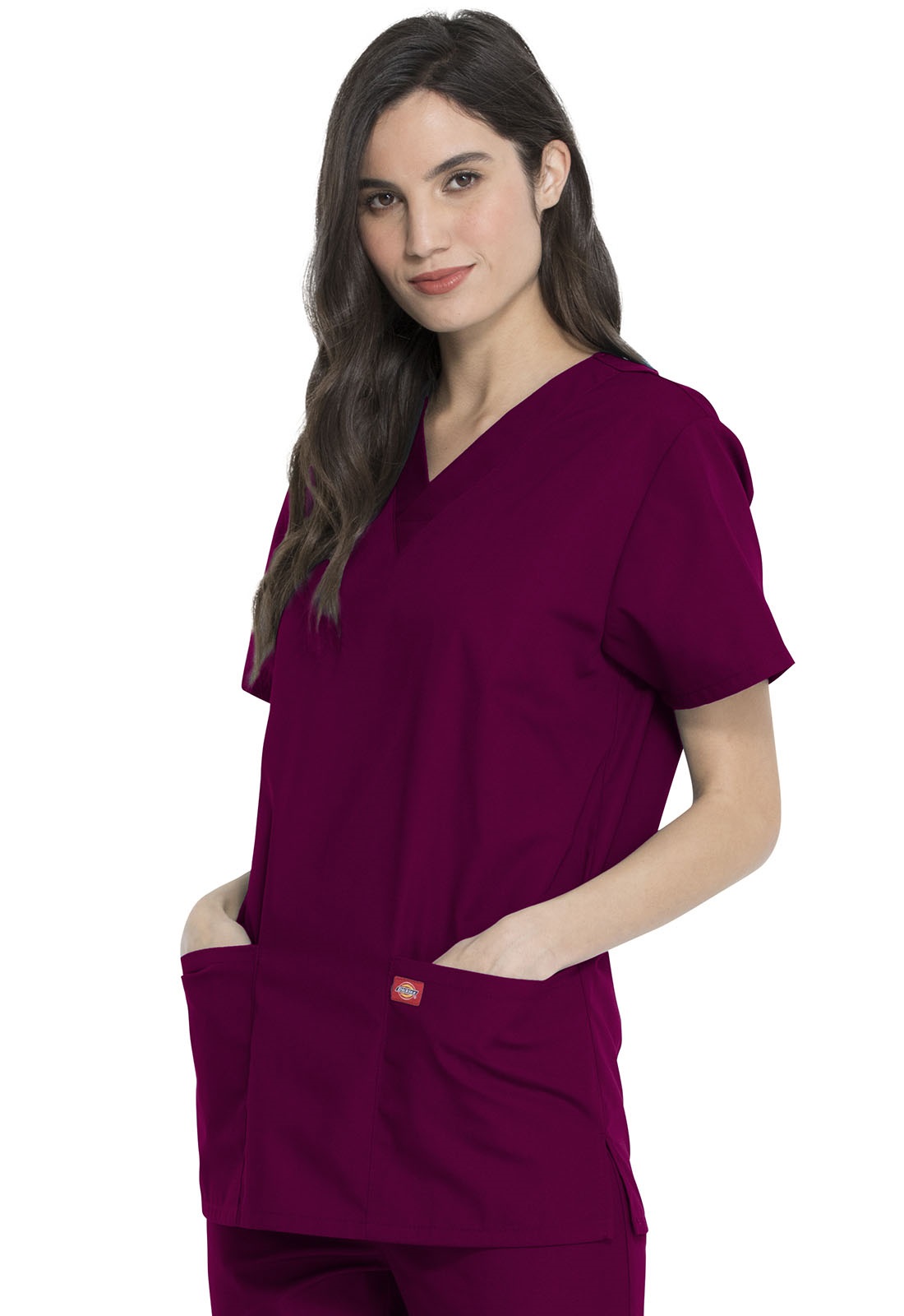 Straight cut. V-neck with 2 pockets at the bottom. Drawstring pants feature a back pocket for your storage needs