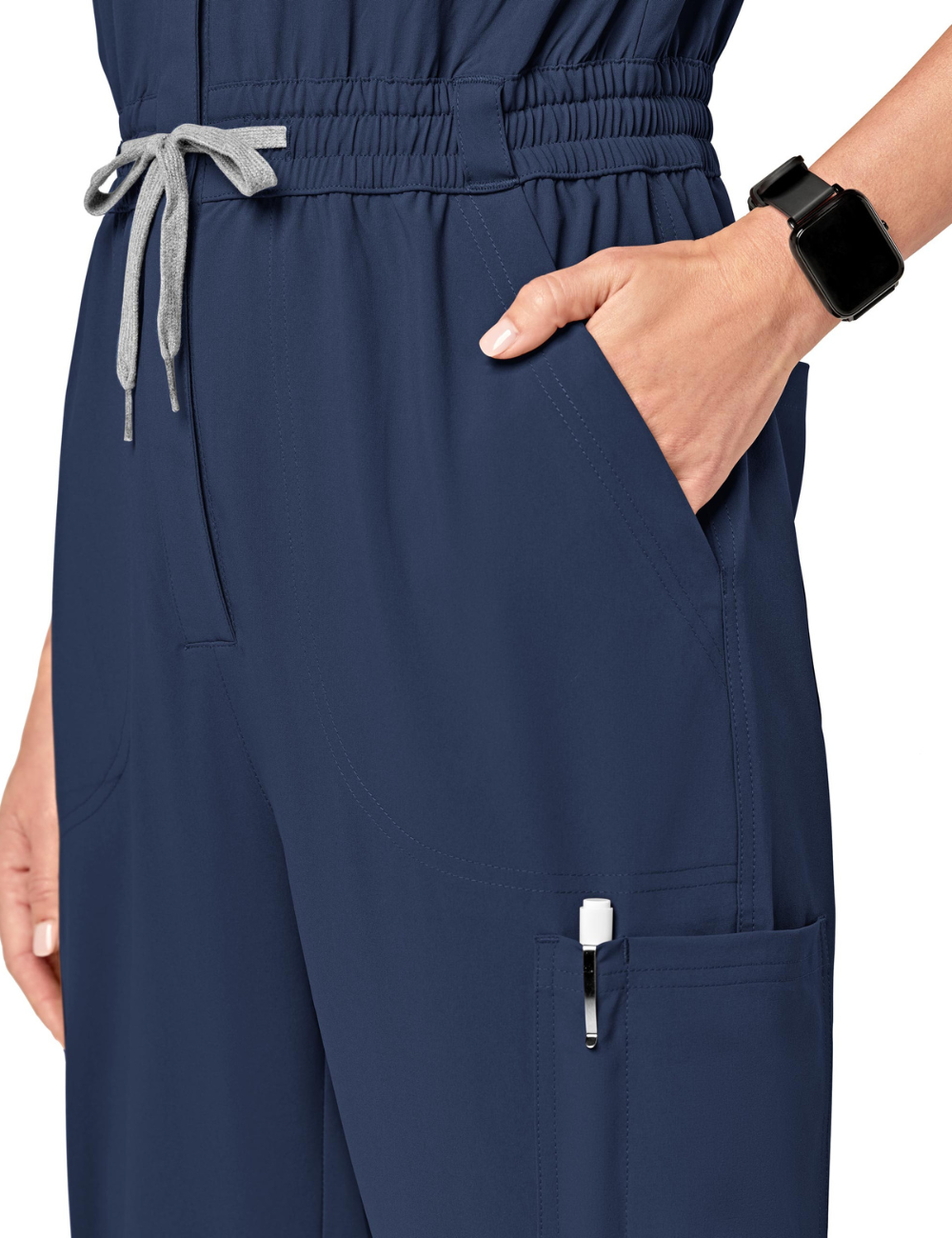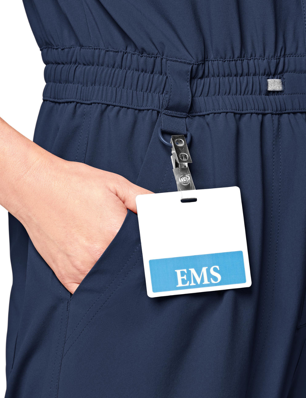A V-neck medical suit, fitted with multiple details and pockets, which is suitable for all medical professions.