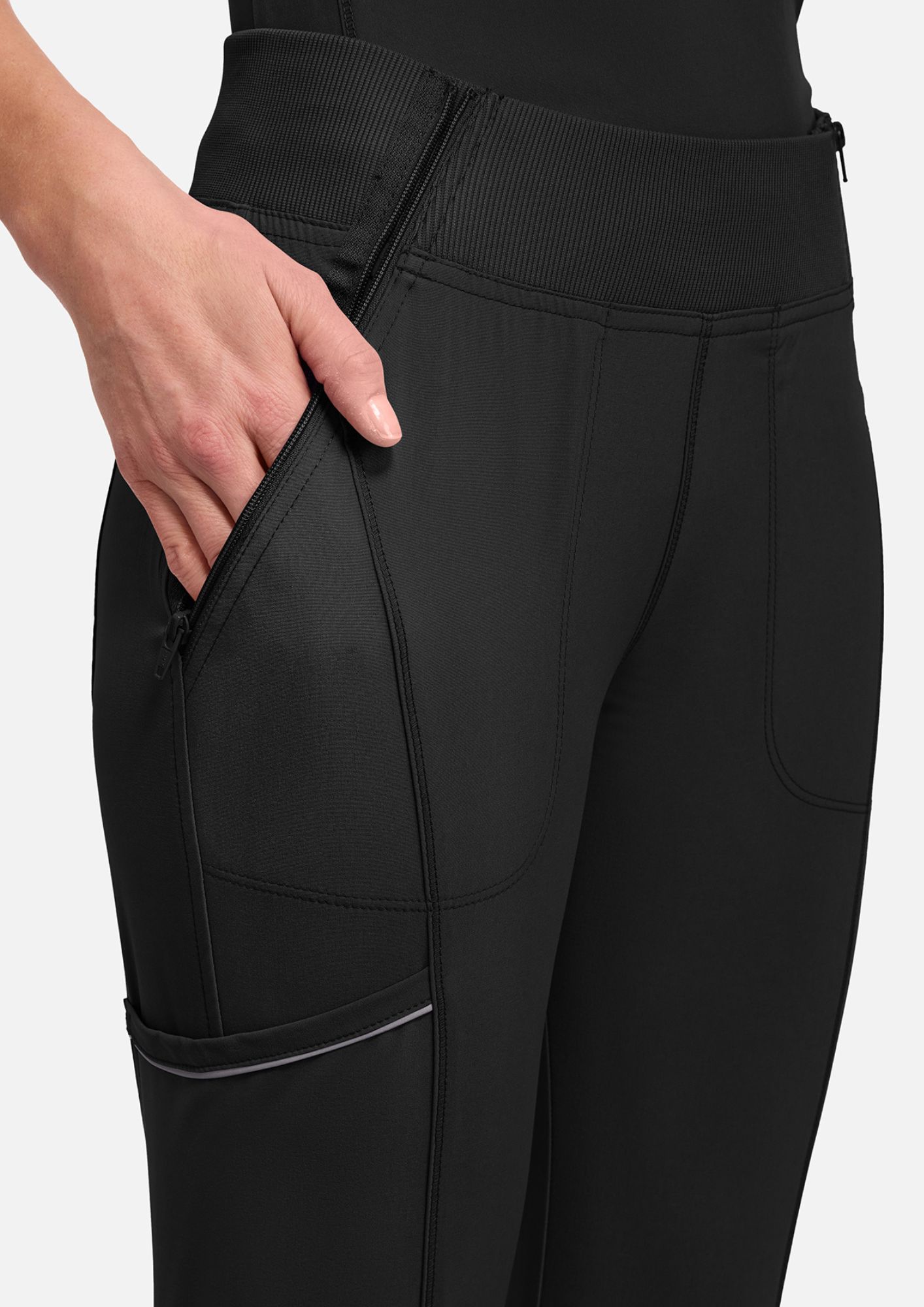 The soft ribbed elastic waistband gently follows the body’s shape for a comfortable, secure fit, while the ribbed cuffs add a modern, sporty touch. Vertical front leg seams and a back yoke seam create a clean, structured silhouette, enhanced by fully topstitched details for a polished, professional look. Highly functional, these pants feature five practical pockets: two angled front zippered pockets, a right-side cargo pocket with reflective trim for added safety and style, and two back patch pockets.