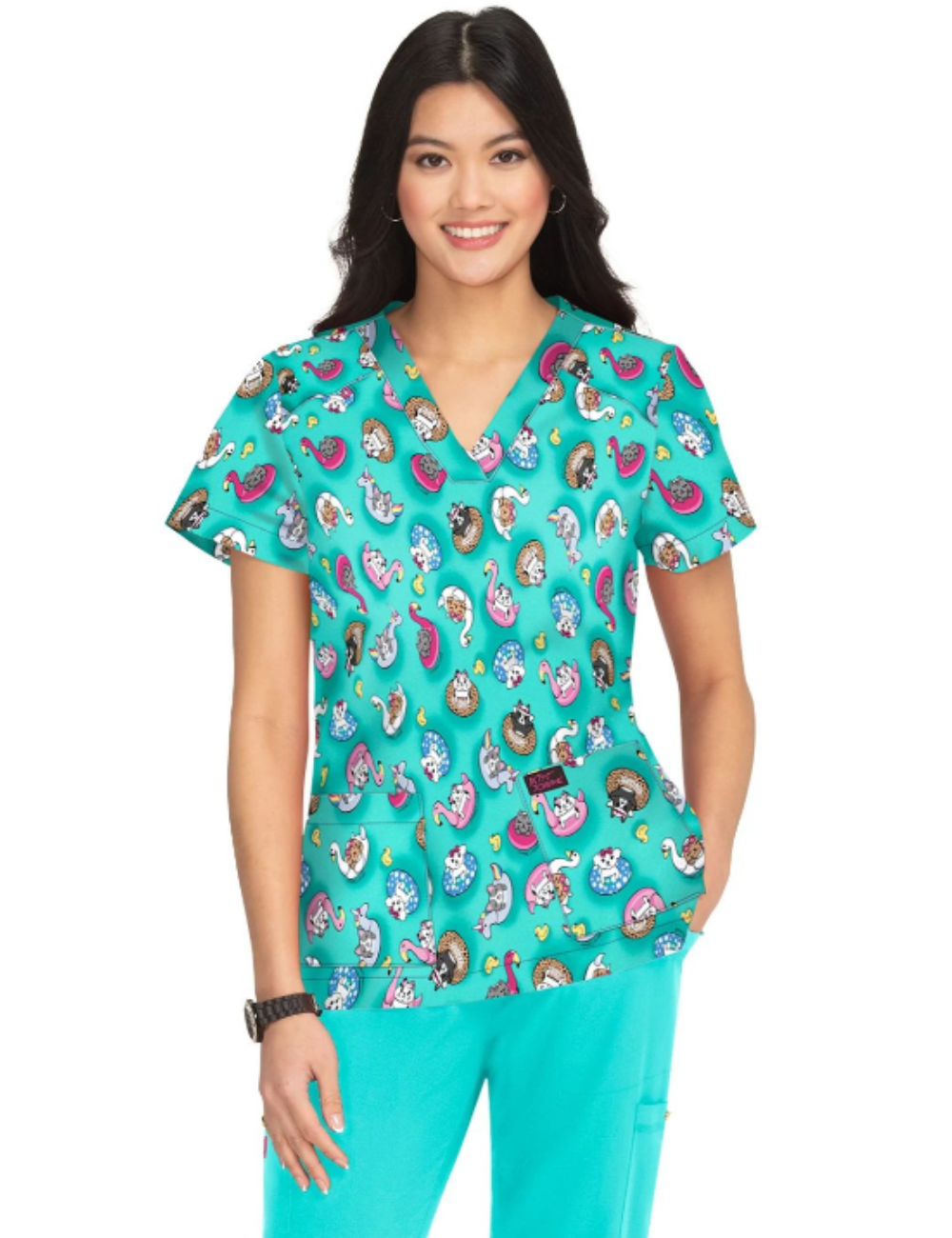 Women's medical blouse dogs and cats buoys on blue background, Koi Collection (B120PR-PPY)