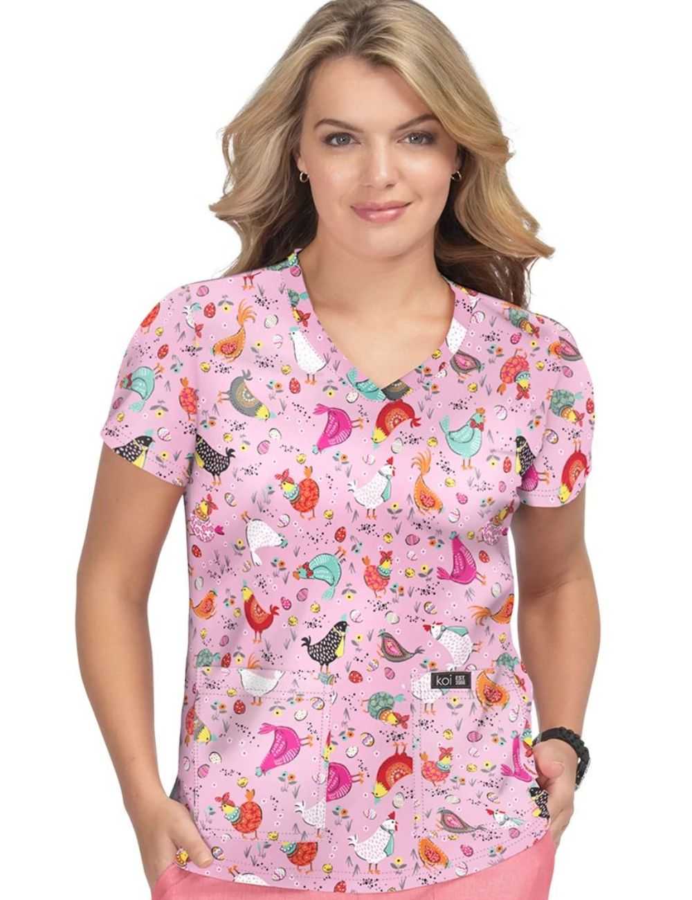 This printed V-neck medical blouse, with its multiple details, from "KOI", is suitable for all medical professions.