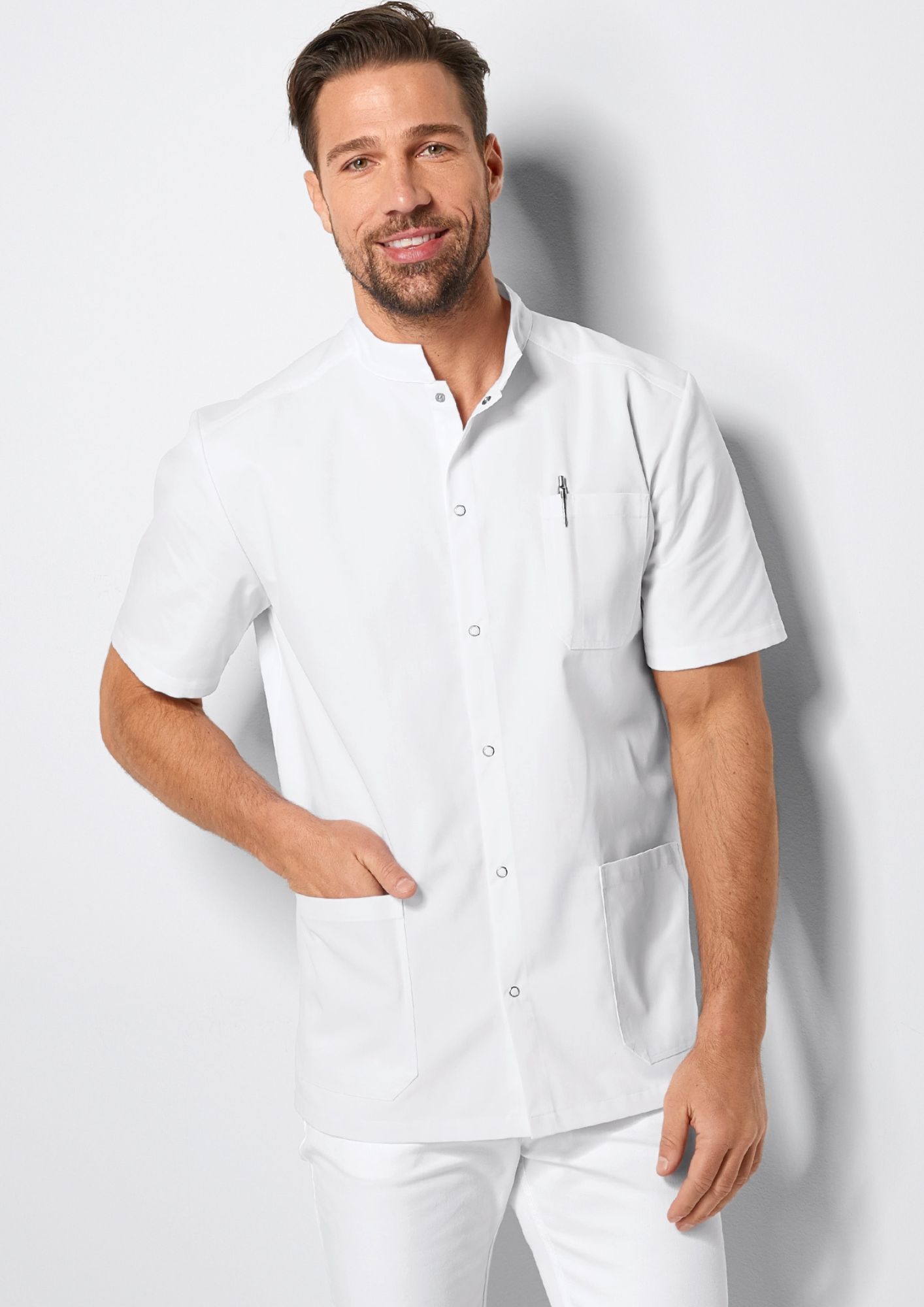 Luce un estilo profesional dinámico con la blusa médica para hombre ARNES, con moderno cuello alto y prácticos botones a presión, equipada con 3 bolsillos funcionales y aberturas laterales para un confort óptimo y total libertad de movimiento durante todo el día.