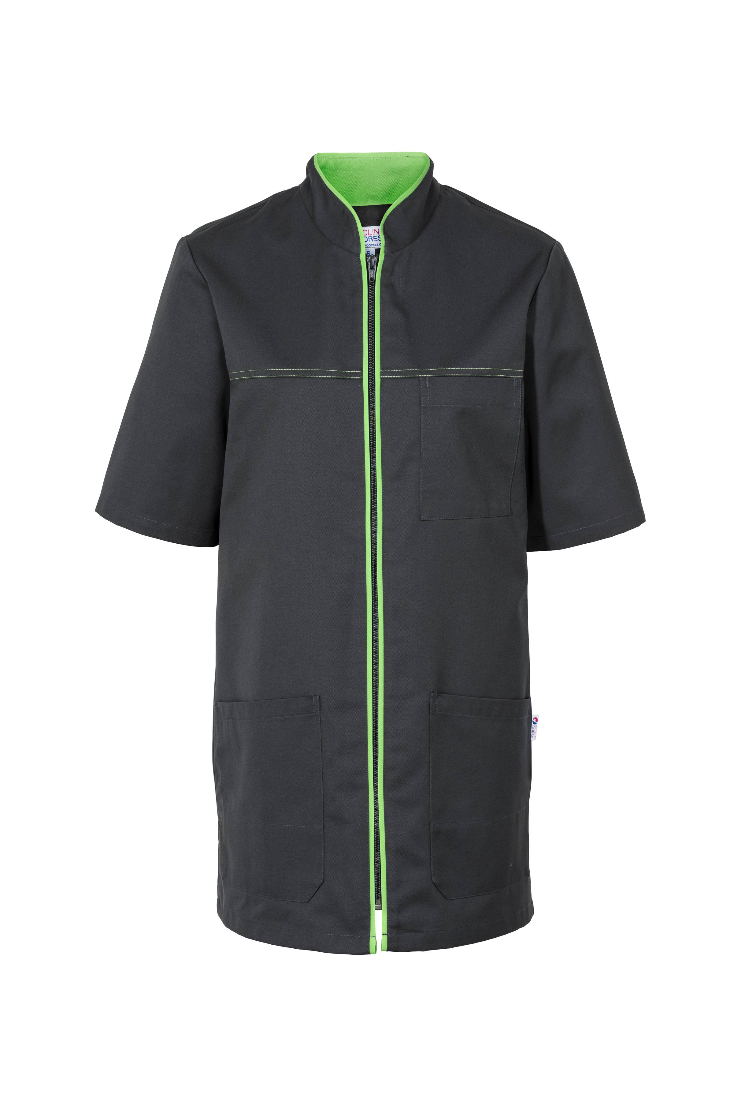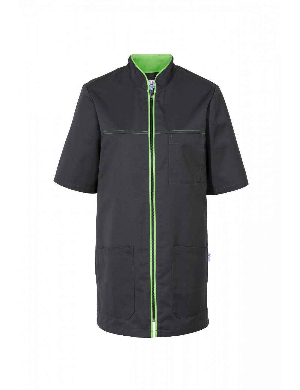 Blusa unisex, cuello recto, cremallera, 1 bolsillo en el pecho y 2 bolsillos de parche, llavero con correa en el bolsillo derecho, aberturas laterales.