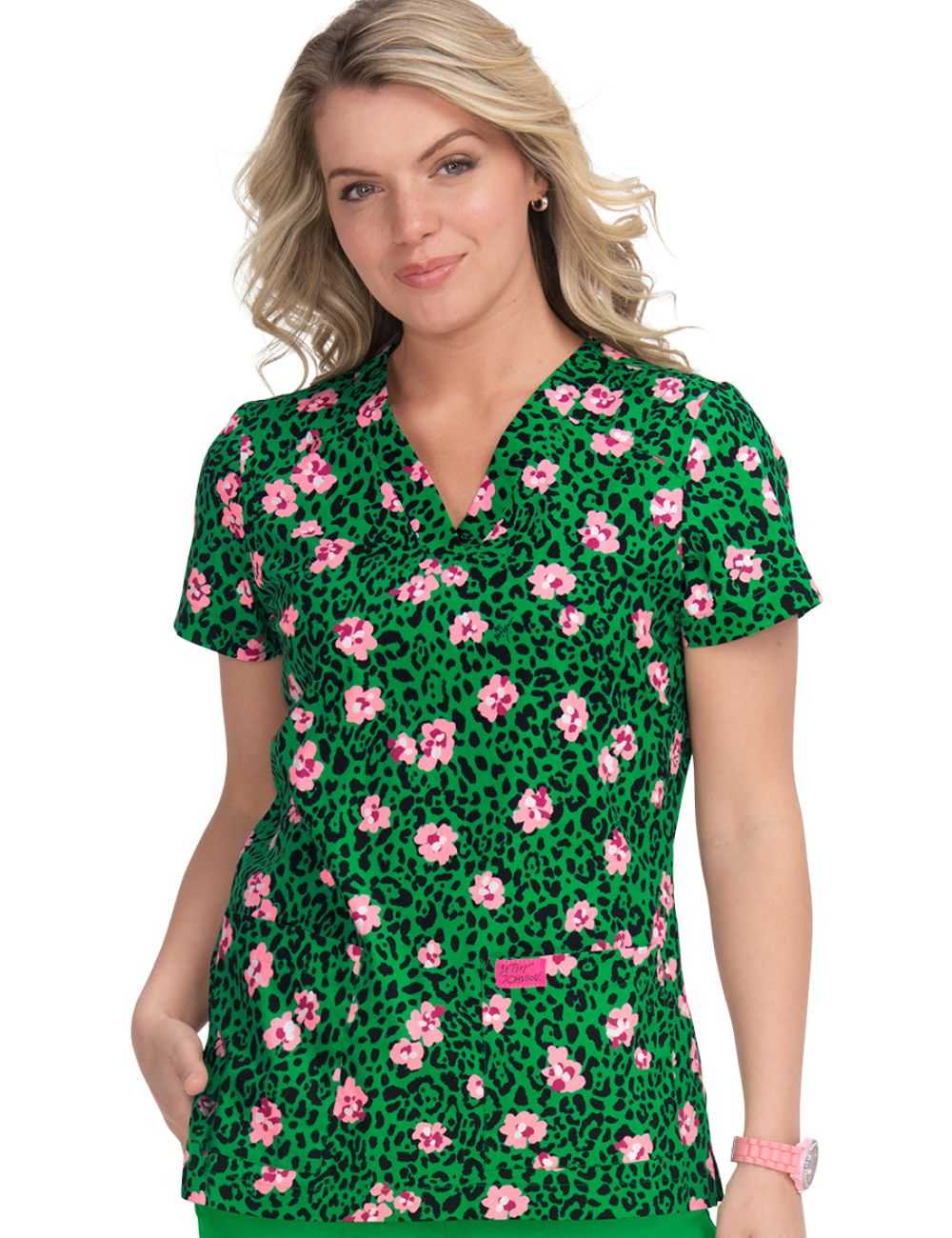 Esta blusa médica estampada con cuello en V y múltiples detalles de "KOI" es adecuada para todas las profesiones médicas.