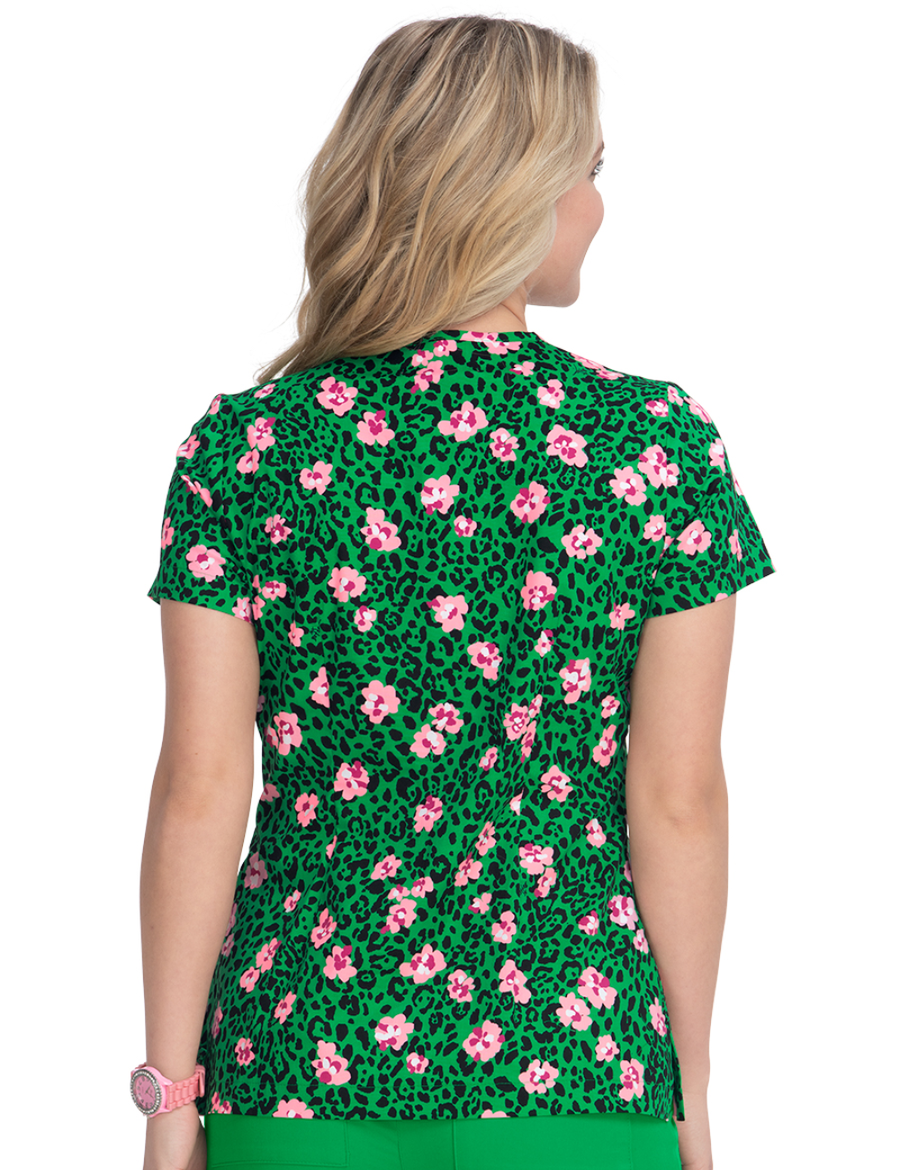Bata médica con estampado de leopardo y flores sobre fondo verde