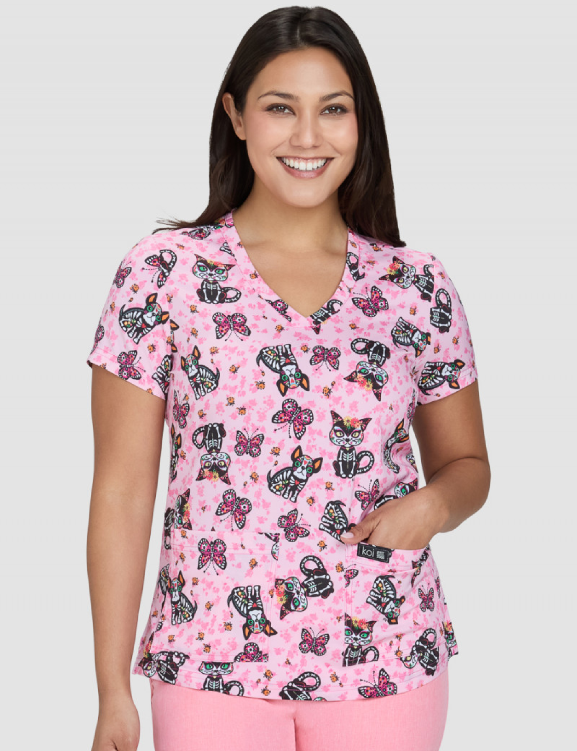 Esta blusa médica estampada con cuello en V y múltiples detalles de "KOI" es adecuada para todas las profesiones médicas.