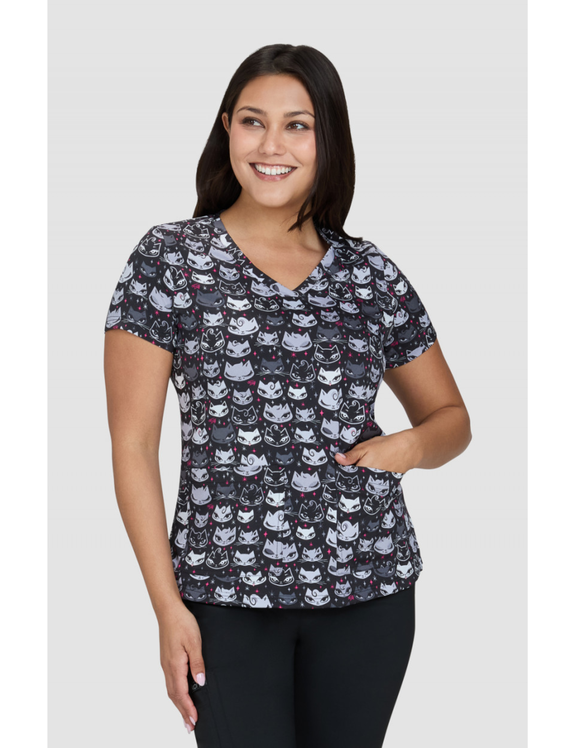 Esta blusa médica estampada con cuello en V, con sus múltiples detalles, es adecuada para todas las profesiones médicas; Dentistas, enfermeras, cirujanos, osteópatas, veterinarios…