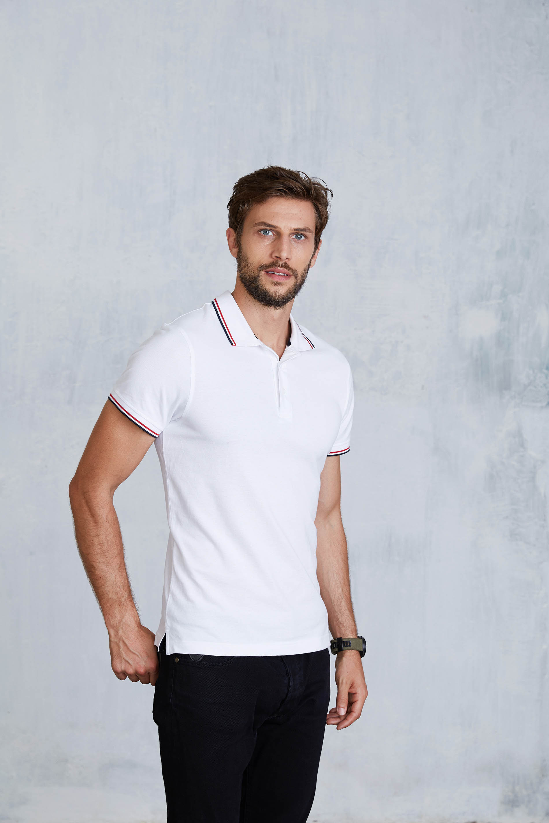 100% algodón piqué. Tira de botones 3 botones. Banda de contraste de limpieza en el escote y en las rajas laterales. Acabado acanalado de contraste con ribetes de contraste en el cuello y en las mangas inferiores. Prenda con doble aguja en el fondo. Corte de hombre.