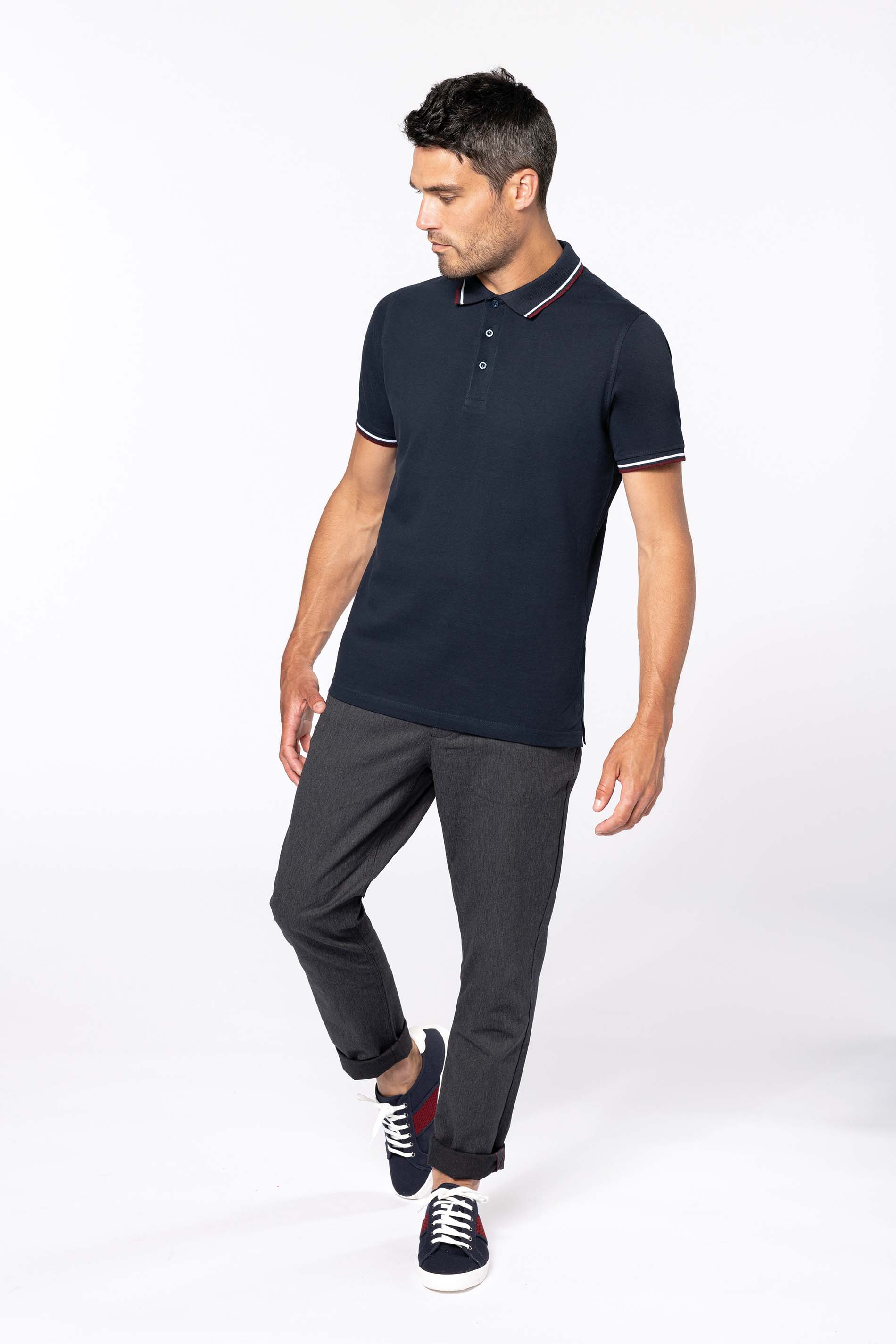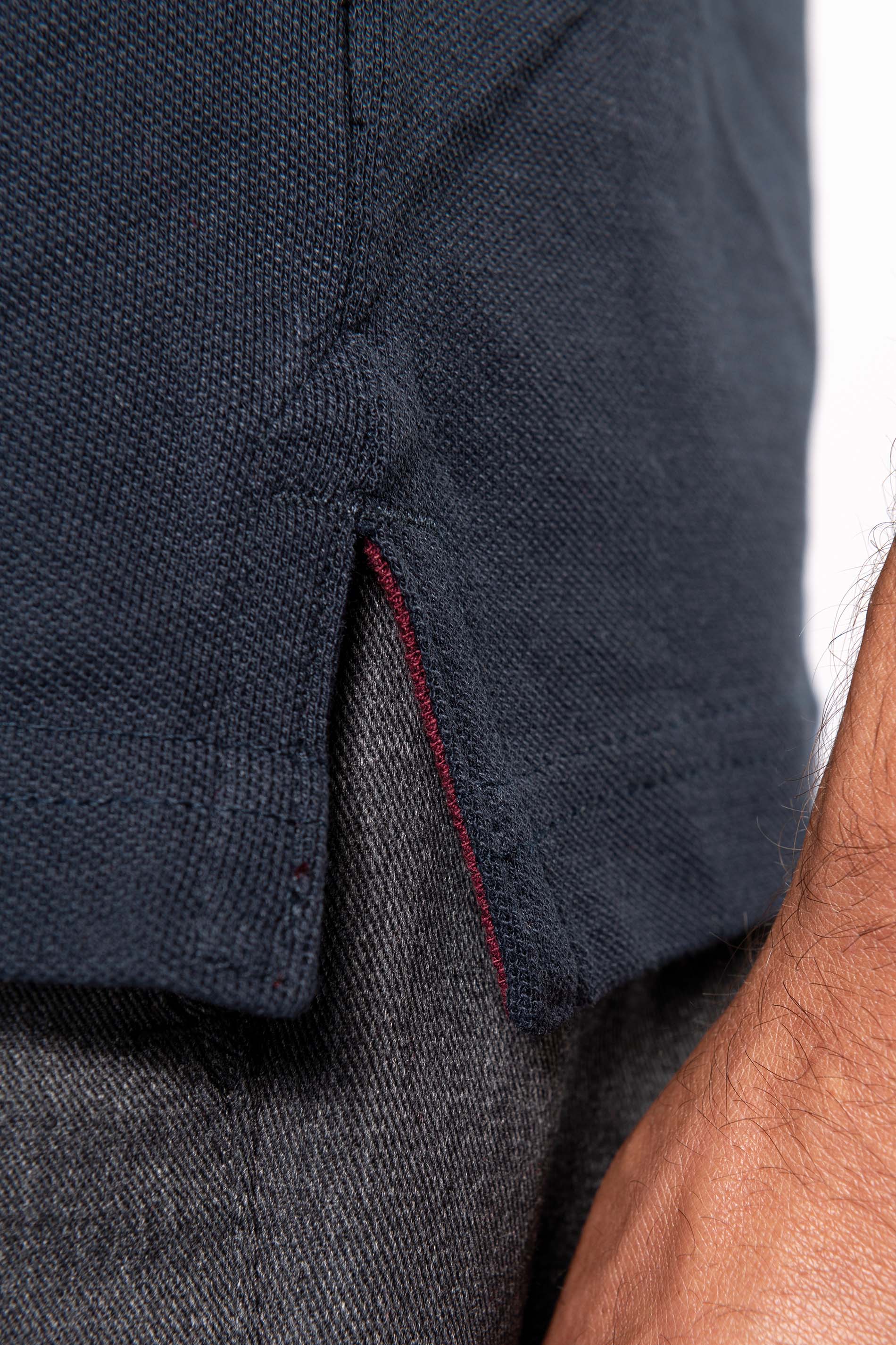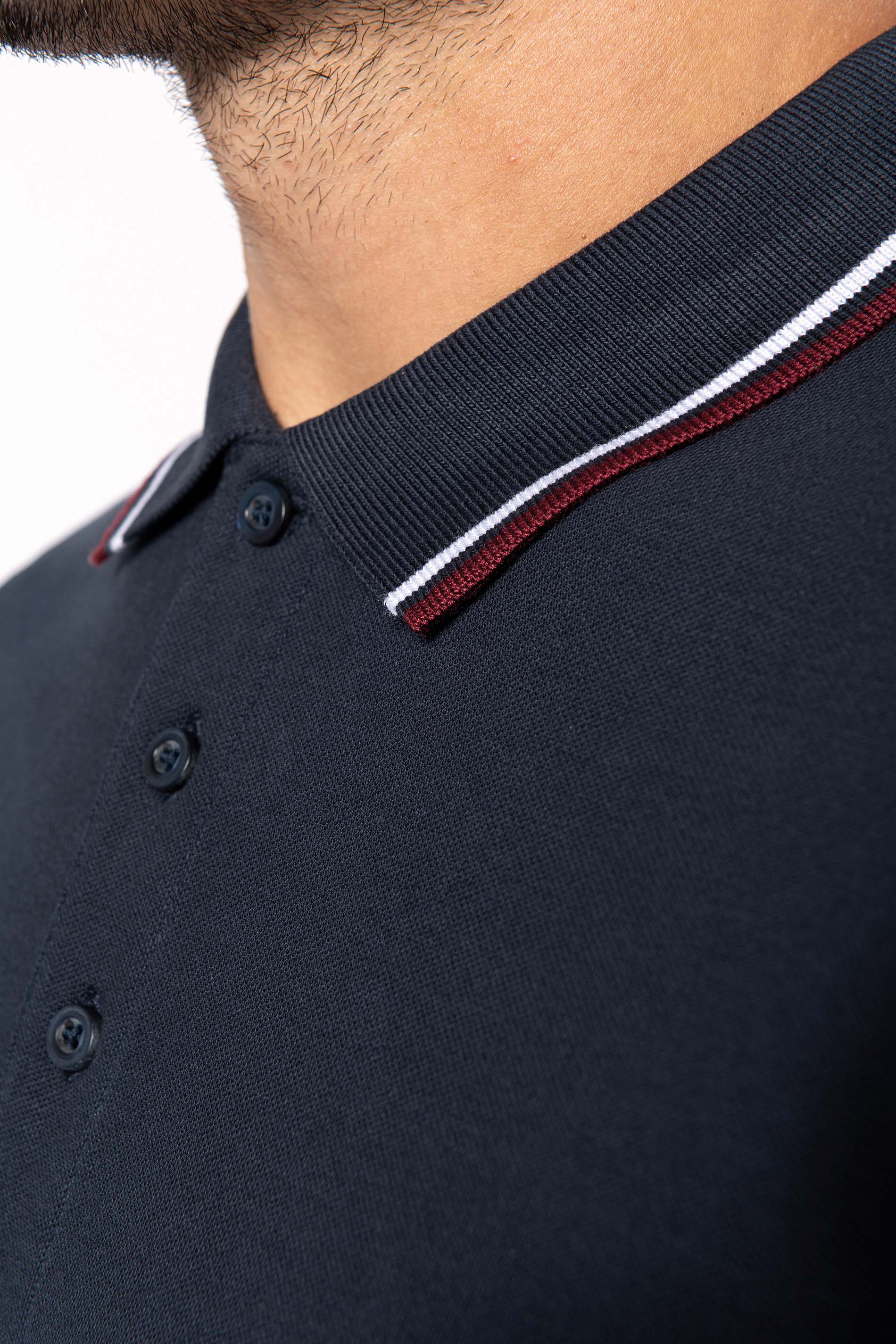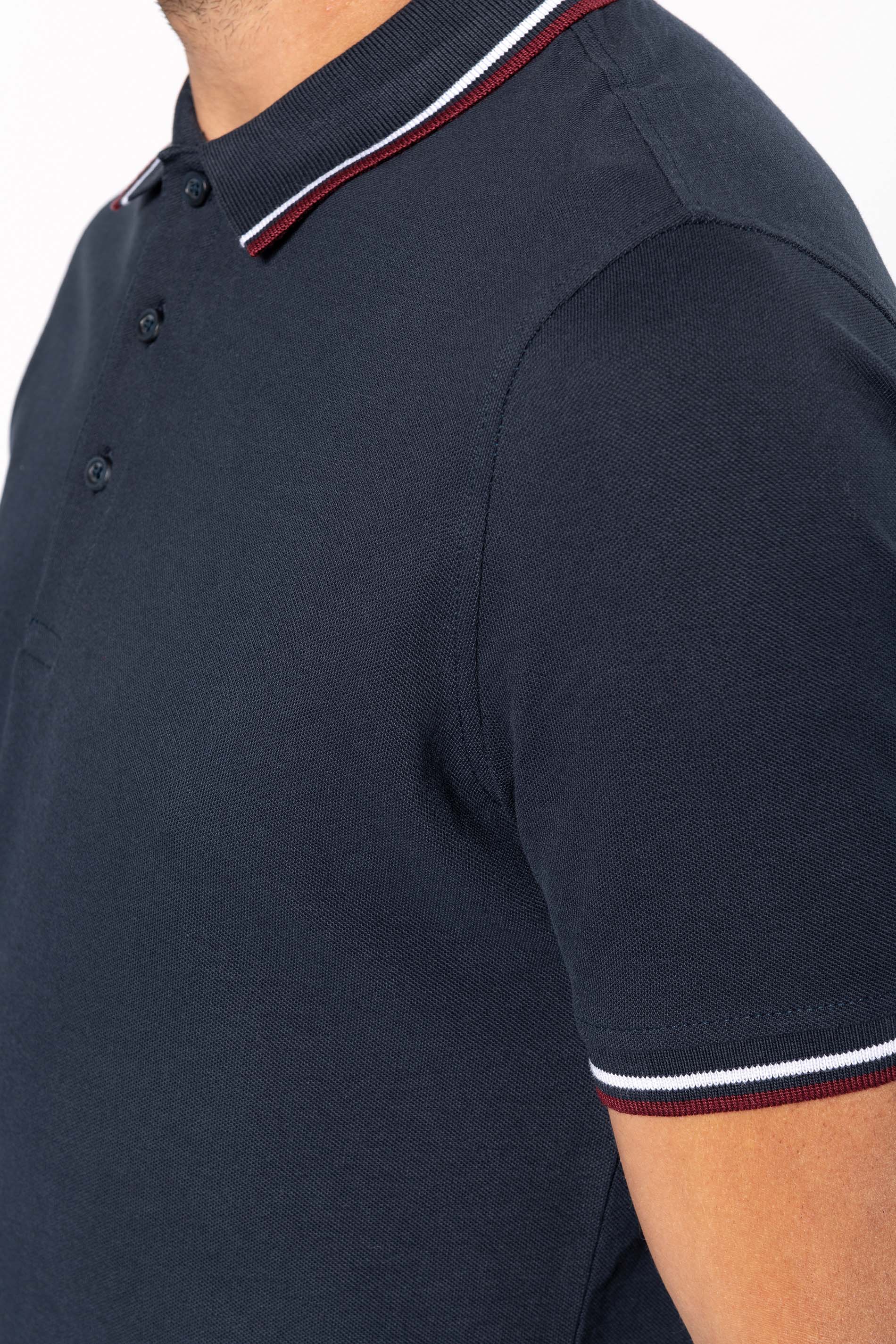100% algodón piqué. Tira de botones 3 botones. Banda de contraste de limpieza en el escote y en las rajas laterales. Acabado acanalado de contraste con ribetes de contraste en el cuello y en las mangas inferiores. Prenda con doble aguja en el fondo. Corte de hombre.
