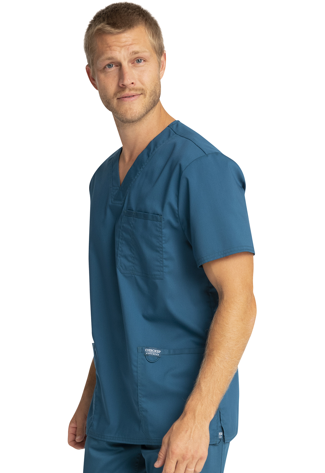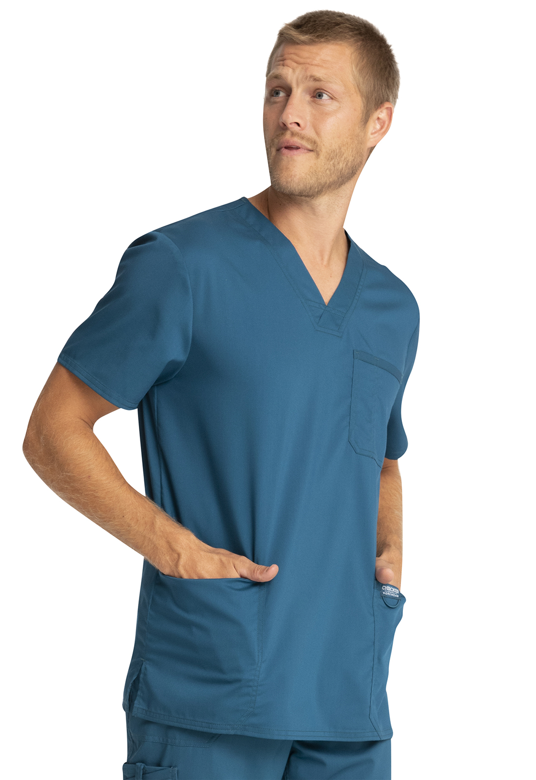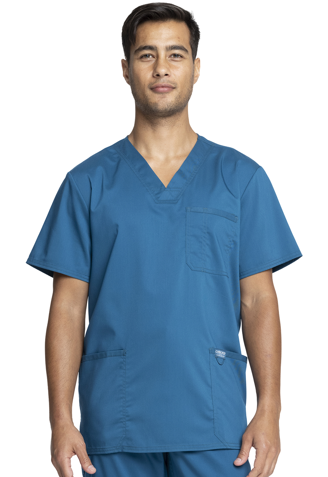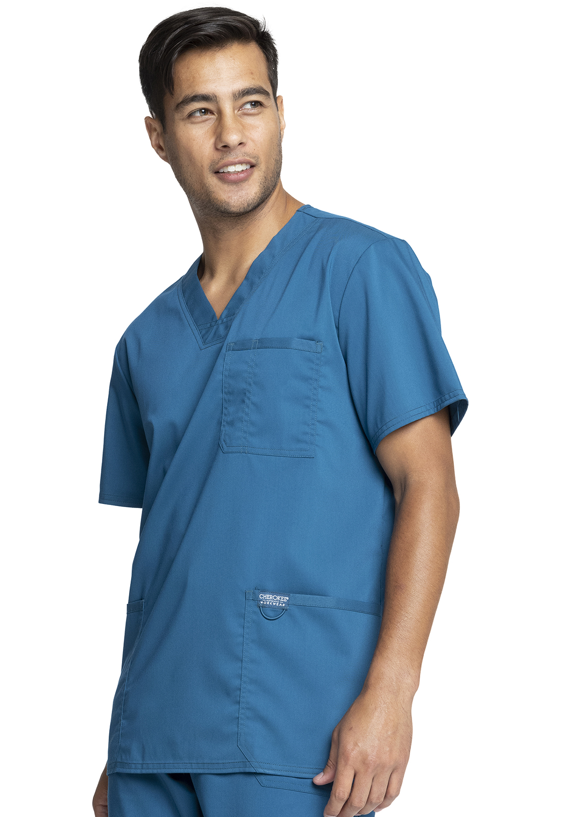 Esta bata médica para hombre, con cuello en V y múltiples detalles, de "Cherokee", es adecuada para todas las profesiones médicas.