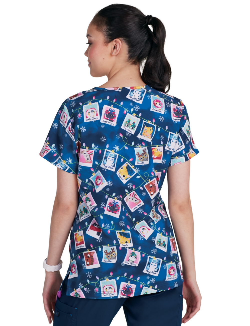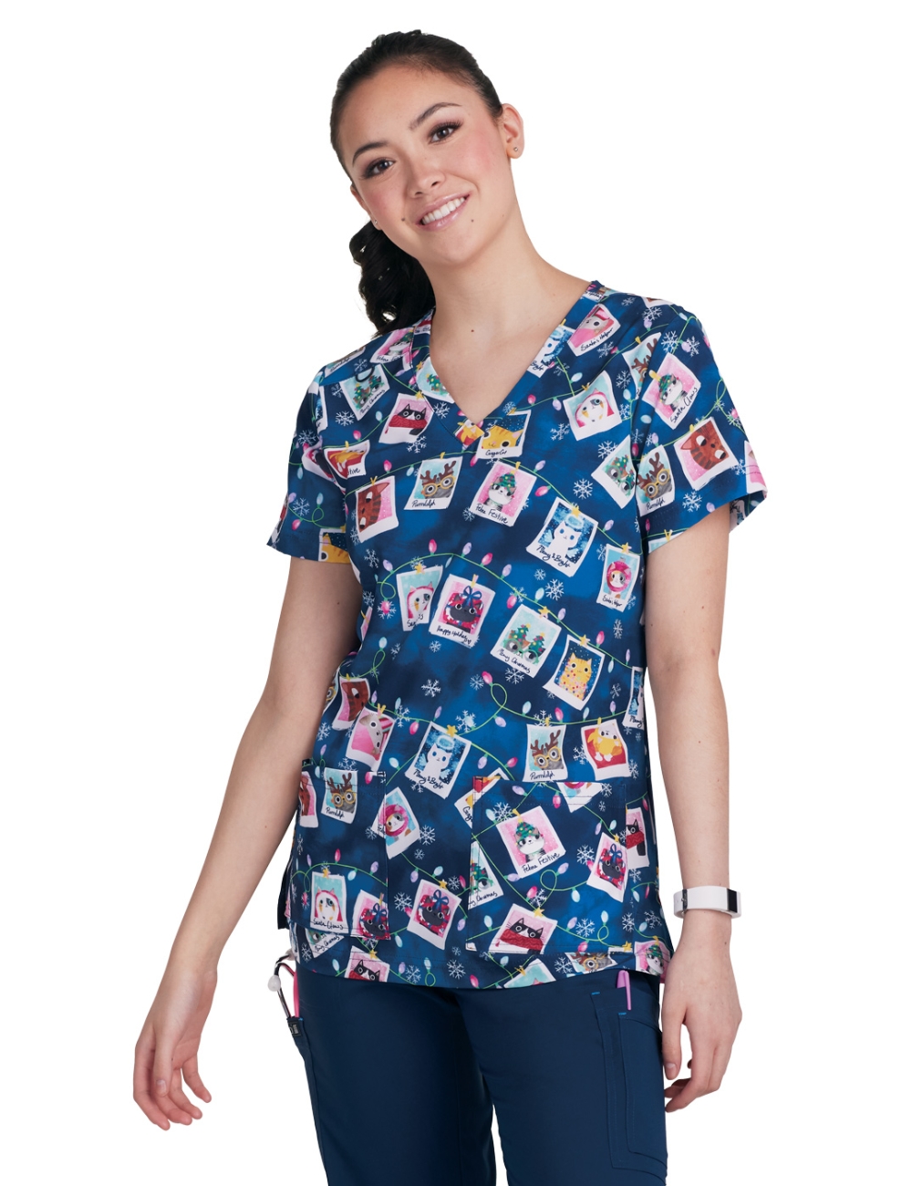 Esta blusa médica estampada con cuello en V y múltiples detalles de "KOI" es adecuada para todas las profesiones médicas.