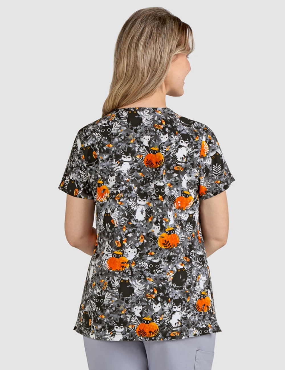 Esta blusa médica estampada con cuello en V y múltiples detalles de "KOI" es adecuada para todas las profesiones médicas.
