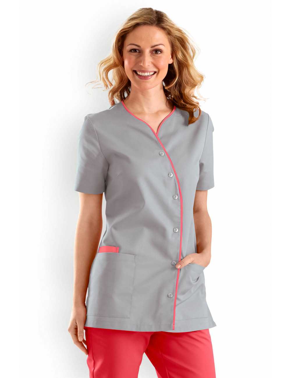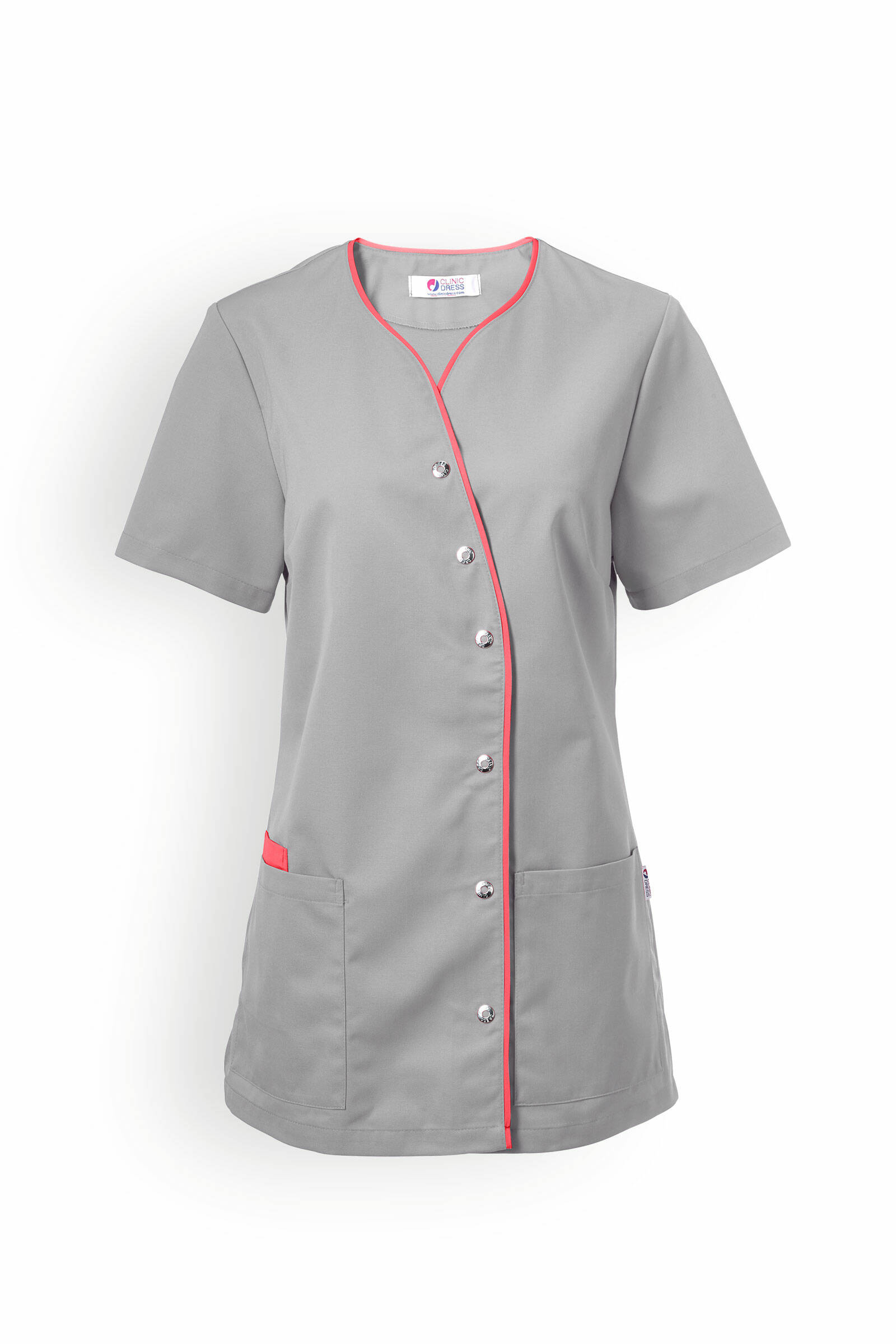 Bata médica en cuello en V, cierre a presión, dardos en el pecho y dardos en la cintura en la espalda.
