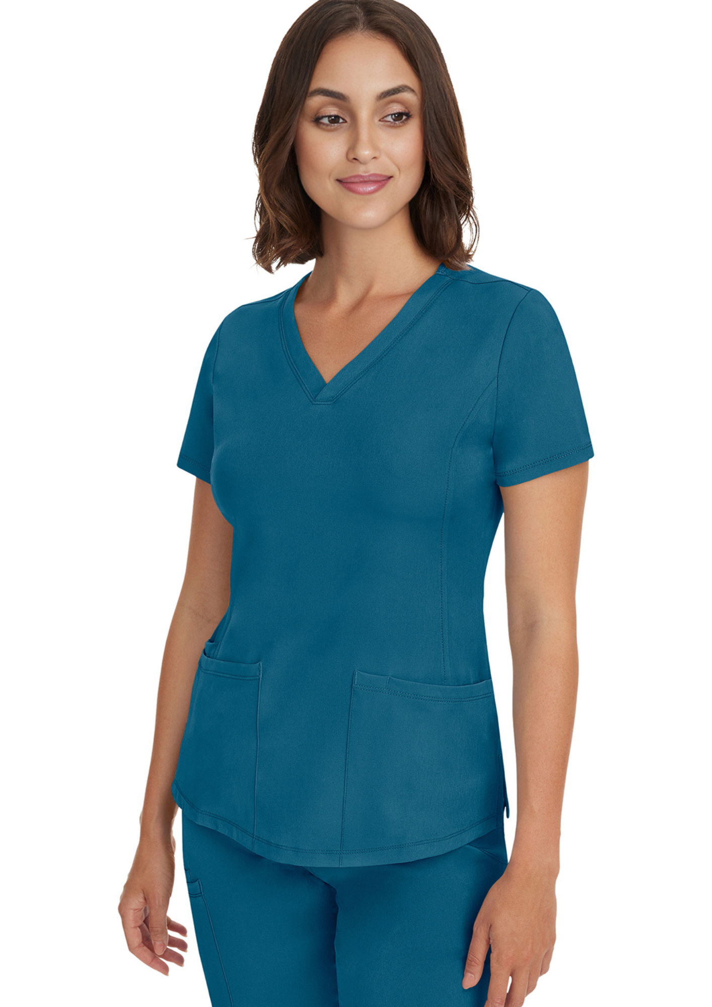 Esta blusa médica para mujer combina estilo y practicidad para acompañar a los profesionales de la salud en su día a día. Con su cuello en V atemporal, aberturas laterales y corte entallado, se adapta perfectamente a la silueta al tiempo que ofrece una gran libertad de movimiento.