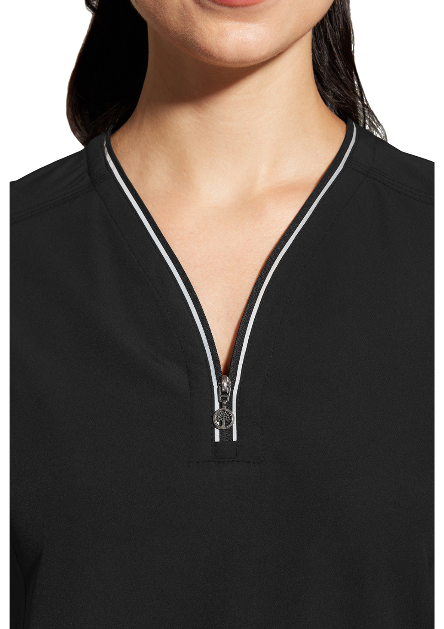 Con su cuello en V moderno con cierre, esta blusa ofrece un look profesional y elegante. Su corte ajustado realza la silueta a la vez que garantiza libertad de movimiento, gracias a las aberturas laterales. Muy práctica para el día a día, cuenta con 2 bolsillos para mantener tus esenciales al alcance de la mano y un bolsillo para bolígrafo.
