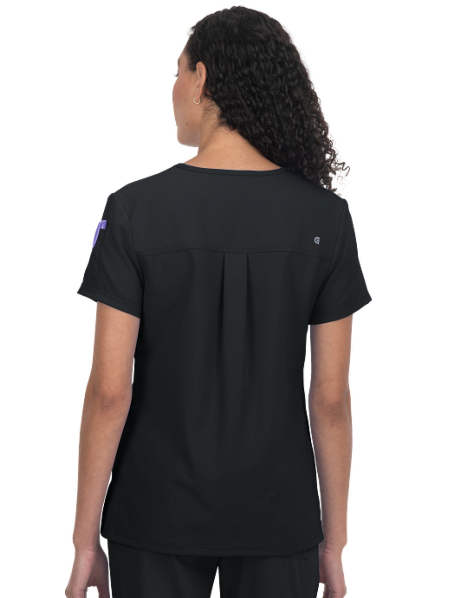Esta blusa médica con cuello en V, con su corte entallado y sus múltiples detalles, es apta para todos los profesionales médicos: dentistas, enfermeras, veterinarios, osteópatas, etc.