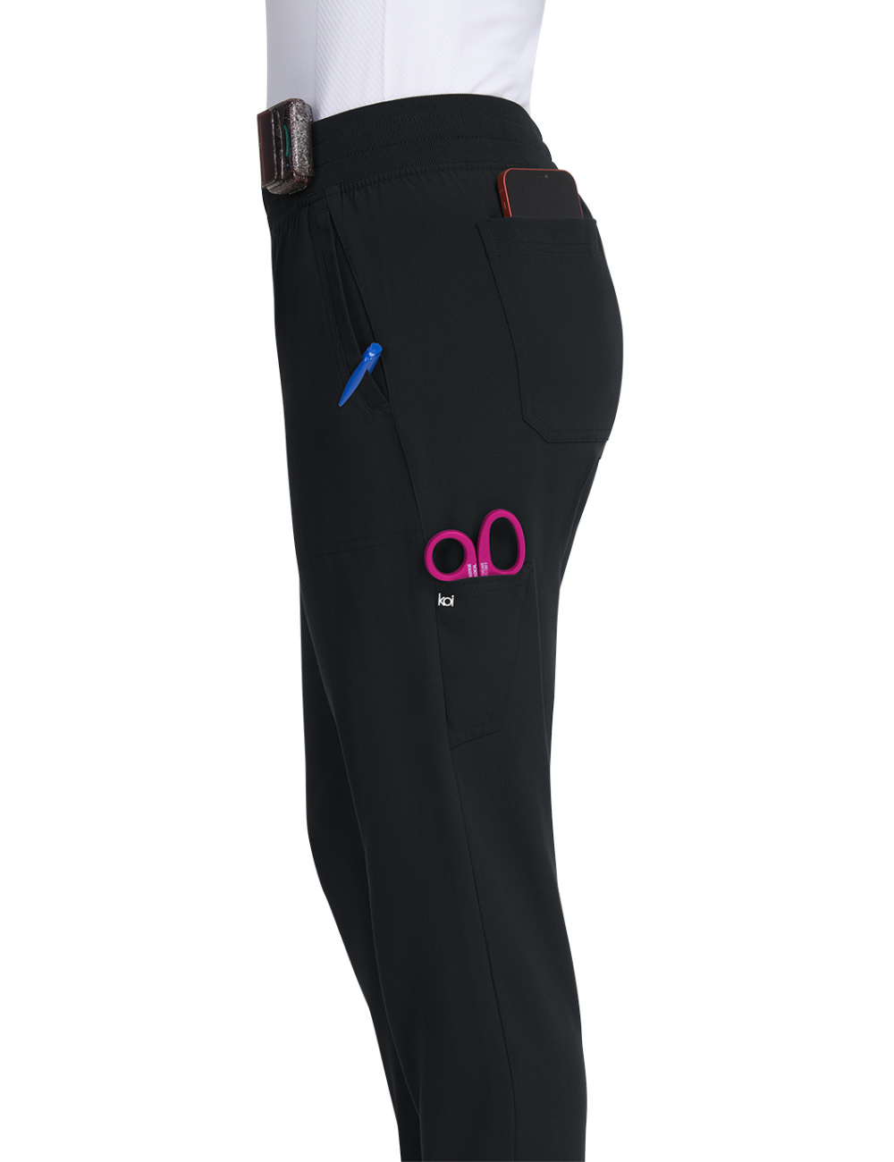 Los pantalones médicos de "KOI", con su corte jogger en la parte trasera de la pierna y sus múltiples detalles, son adecuados para todas las profesiones médicas.