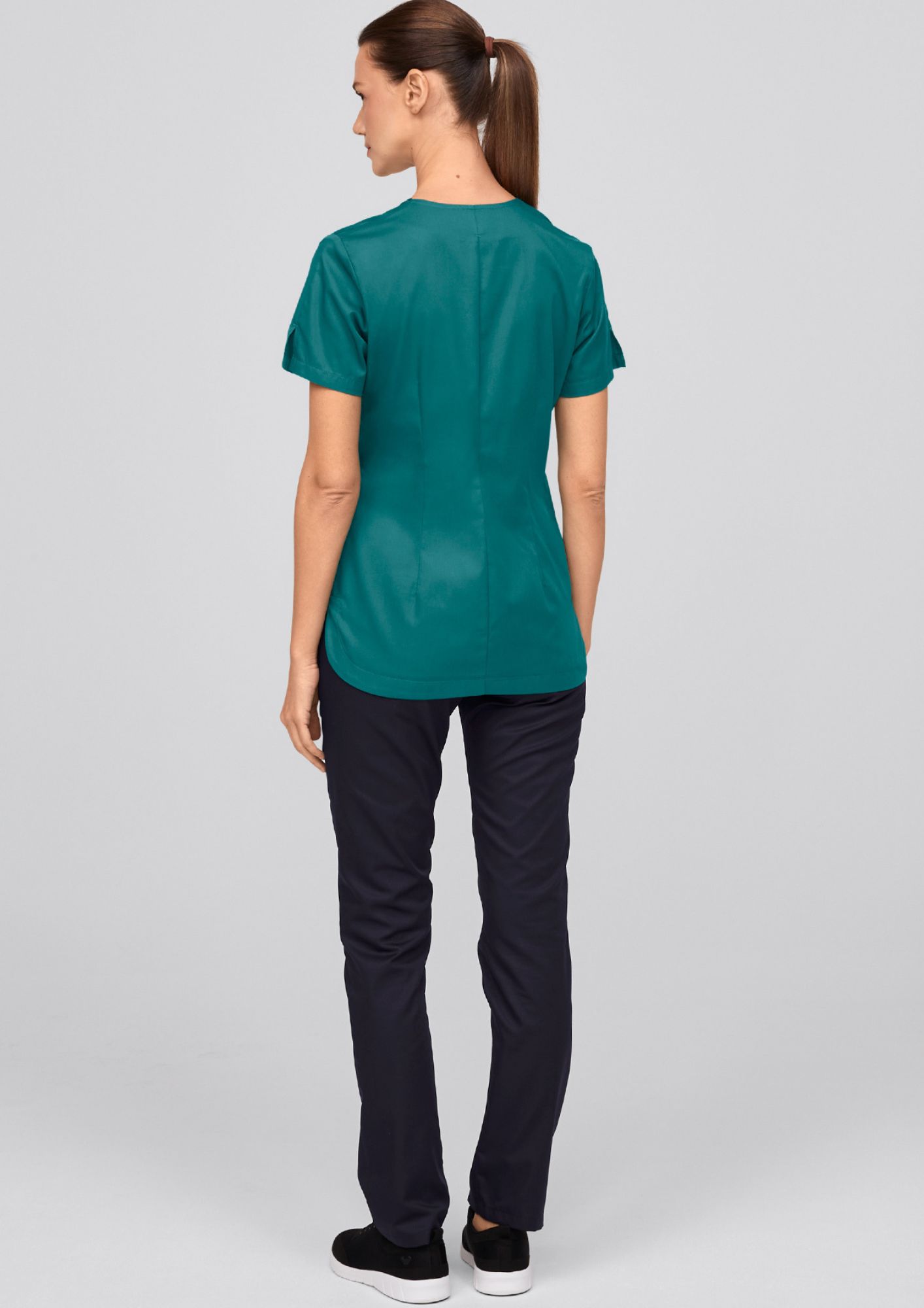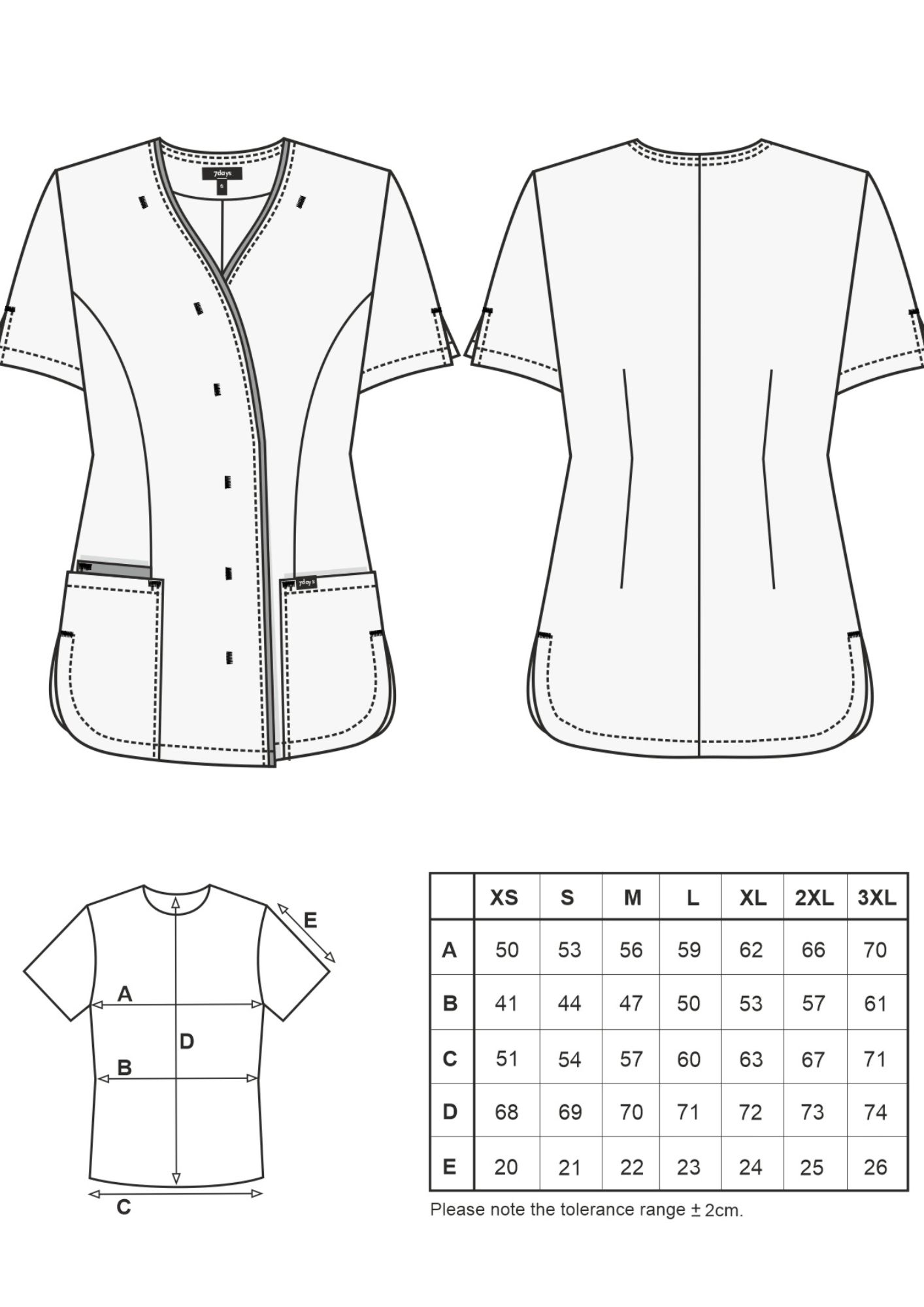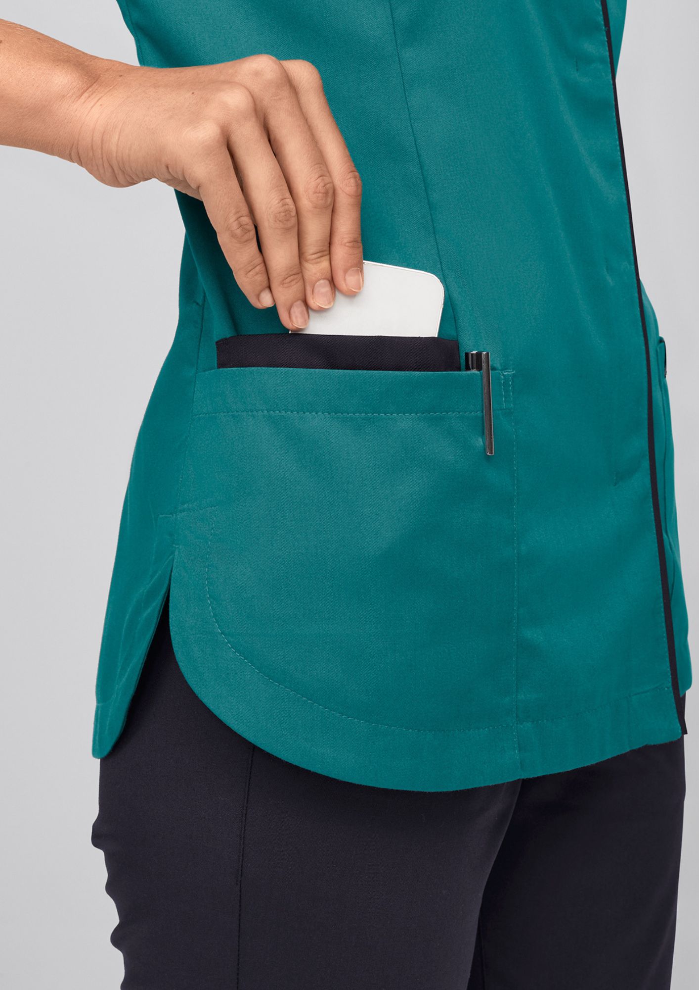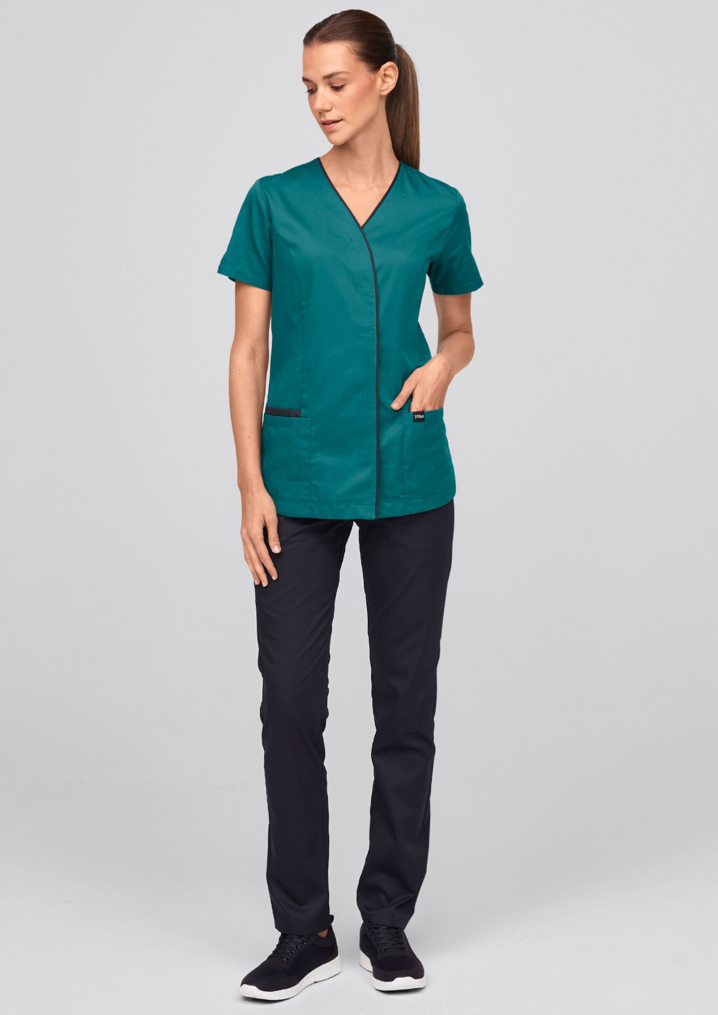 Affirmez votre style professionnel avec la blouse médicale PARIS, au col V élégant et à la coupe cintrée flatteuse, dotée d’un boutonnage à pressions dissimulées, de passepoils colorés modernes et de 3 poches pratiques pour allier élégance et fonctionnalité au quotidien.
