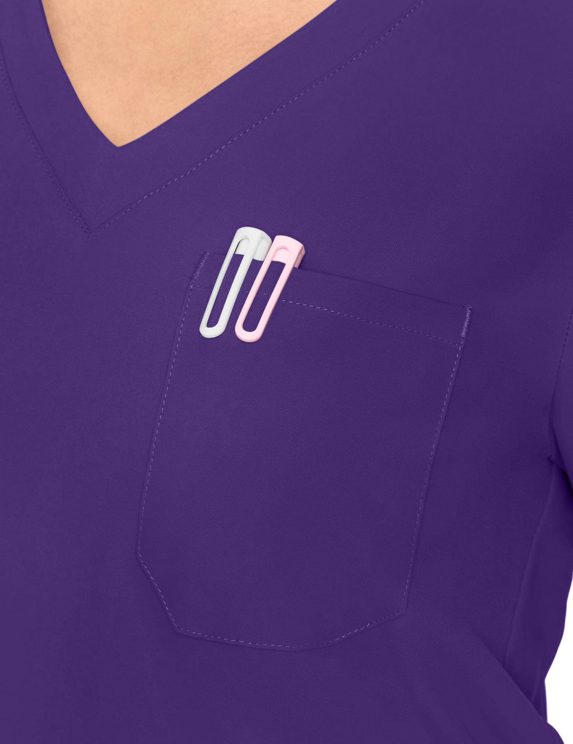 Conçue pour les professionnelles actives, cette blouse combine tissu performant et coupe moderne pour une liberté de mouvement totale, idéale pour suivre votre rythme effréné tout en restant élégante. Son col en V flatteur apporte une touche de féminité, tandis que la poche poitrine pratique et l’attache élastique pour badge gardent vos essentiels toujours à portée de main.