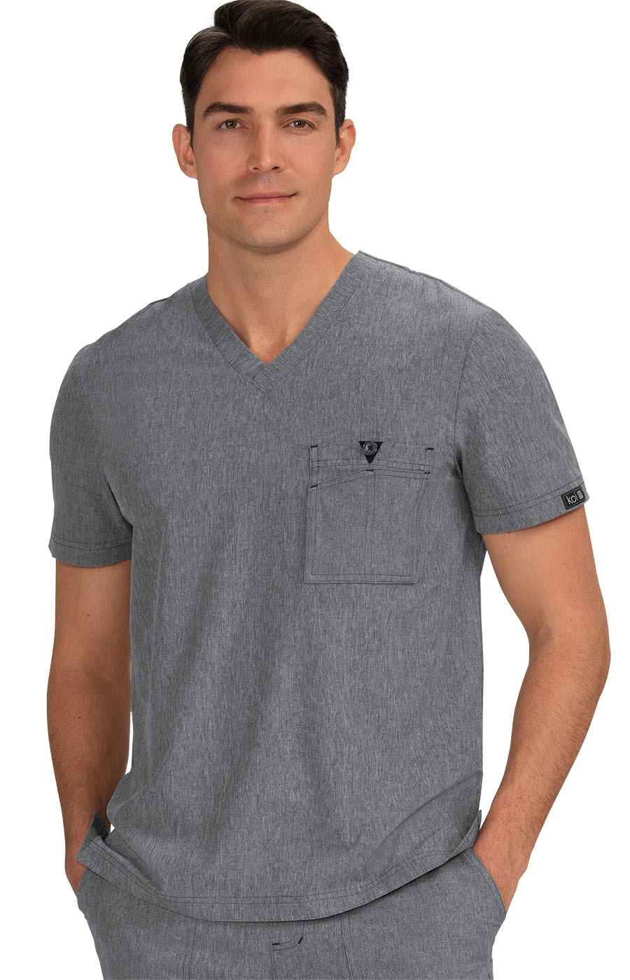 Blouse médicale Homme Koi "Bryan", collection "Koi Basics" (668-) gris chiné vue face Blouse médicale Homme Koi "Bryan", collection "Koi Basics" (668-) gris chiné vue détail