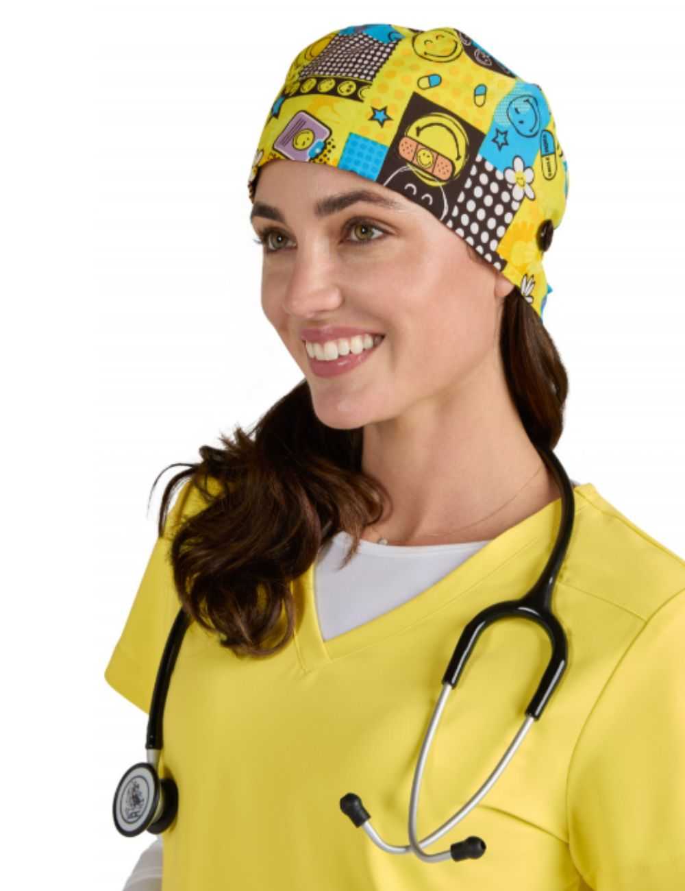 Apportez une touche fun à votre tenue avec notre calot médical motifs Smiley. Unisexe, ajustable et conçu en 100% coton, il garantit confort et hygiène au quotidien. Attache à nœud, bandeau anti-transpiration et entretien facile (40°C en machine). Idéal pour le personnel médical !