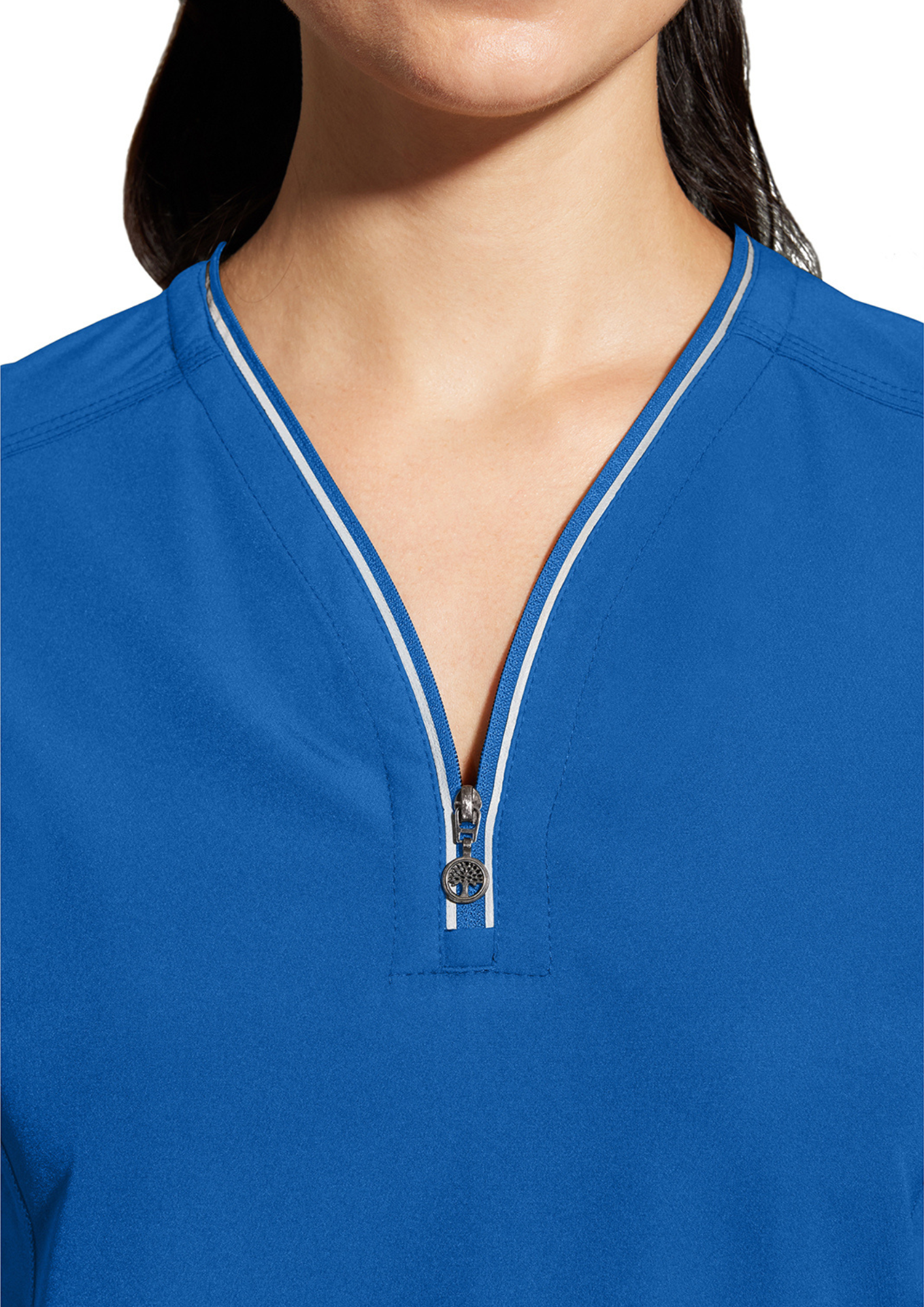 Avec son col en V moderne à fermeture, cette blouse offre un look professionnel et élégant. Sa coupe ajustée met en valeur la silhouette tout en garantissant liberté de mouvement, grâce aux fentes latérales. Pratique au quotidien, elle dispose de 2 poches pour garder vos essentiels à portée de main et une poche pour stylo.