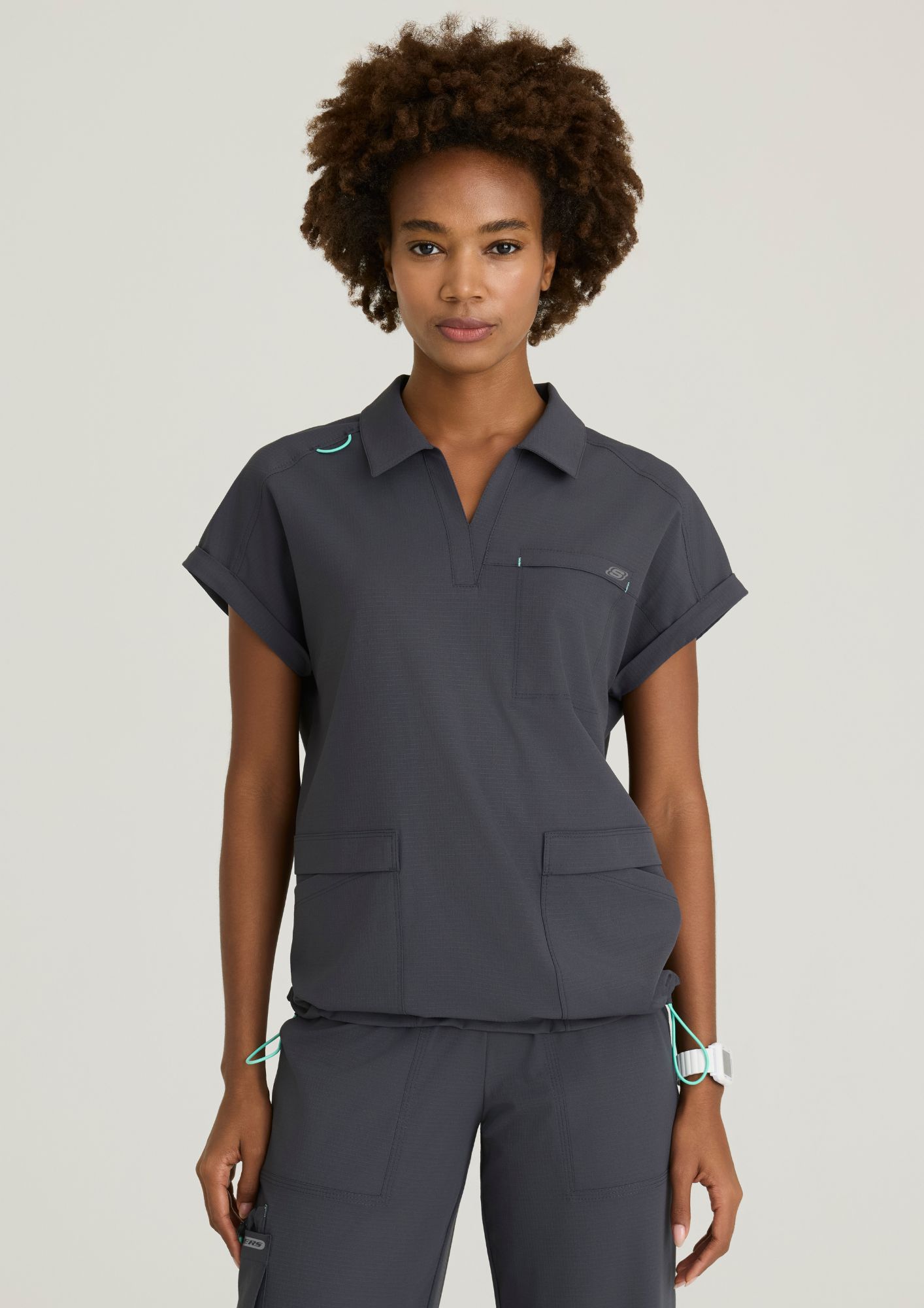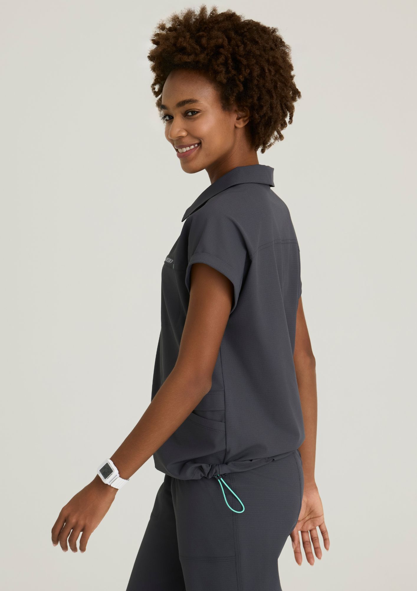 Son col en V combiné à un col chemise, ses manches dolman avec poignets et le pli creux au dos offrent une liberté de mouvement totale, idéale pour vos journées bien remplies. L’ourlet asymétrique ajustable avec cordon interne et bloqueur en plastique, ainsi que la boucle porte-badge sur l’épaule droite, ajoutent une touche moderne et pratique.